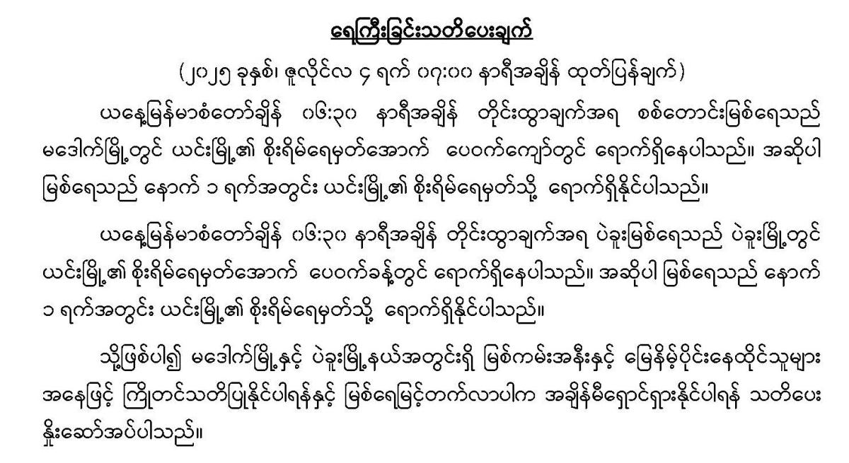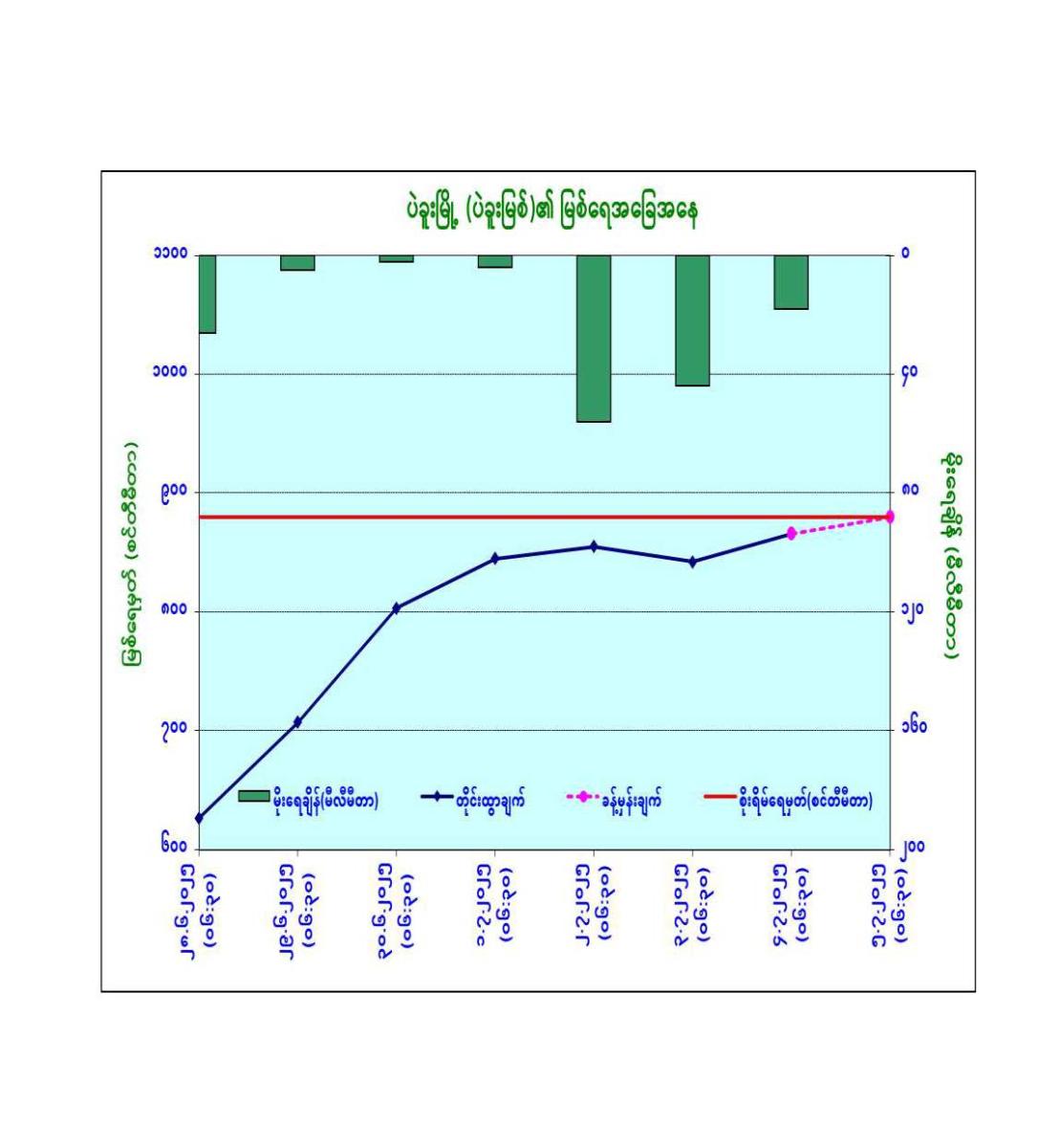 ၂၄-၁၁-၂၀၂၅: ယနေ့မြန်မာစံတော်ချိန် ၀၅:၃၀ နာရီအချိန် တိုင်းထွာချက်များအရ ကပ္ပလီ ပင်လယ်ပြင်တောင်ပိုင်းနှင့် ယင်းနှင့်ဆက်စပ်လျက်ရှိသော မလက္ကာရေလက်ကြားအနီးတွင် ဖြစ်ပေါ်နေသော အားကောင်းသောလေဖိအားနည်းရပ်ဝန်း(Well Marked Low Pressure Area)သည် ဆက်လက်တည်ရှိနေပါသည်။ အဆိုပါအားကောင်းသောလေဖိအားနည်းရပ်ဝန်းသည် အနောက်-အနောက်မြောက်ဘက်သို့ ရွေ့လျားနိုင်ပြီး ပိုမို အားကောင်းလာကာ ဘင်္ဂလားပင်လယ်အော်အရှေ့တောင်ပိုင်းနှင့် ယင်းနှင့်ဆက်စပ်လျက်ရှိသော ကပ္ပလီပင်လယ်ပြင် တောင်ပိုင်းတို့၌ မုန်တိုင်းငယ်(Depression) အဖြစ်သို့ ရောက်ရှိနိုင်သည်ဟု ခန့်မှန်းရပါသည်။ ဘင်္ဂလားပင်လယ်အော် မြောက်ပိုင်းနှင့် အရှေ့အလယ်ပိုင်းတို့တွင် တိမ်အနည်းငယ် ဖြစ်ထွန်းနေပြီး ကပ္ပလီပင်လယ်ပြင်နှင့် ကျန်ဘင်္ဂလား ပင်လယ်အော်တို့တွင် တိမ်အသင့်အတင့်မှ တိမ်ထူထပ်နေပါသည်။