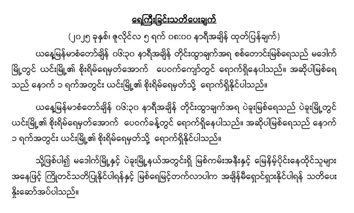 ၂၄-၁၁-၂၀၂၅: ယနေ့မြန်မာစံတော်ချိန် ၁၅:၃၀ နာရီအချိန် တိုင်းထွာချက်များအရ ကပ္ပလီ ပင်လယ်ပြင်တောင်ပိုင်းနှင့် ယင်းနှင့်ဆက်စပ်လျက်ရှိသော မလက္ကာရေလက်ကြားအနီးတွင် ဖြစ်ပေါ်နေသော အားကောင်းသောလေဖိအားနည်းရပ်ဝန်း (Well Marked Low Pressure Area) သည် ဆက်လက်တည်ရှိနေပါ သည်။ အဆိုပါ အားကောင်းသောလေဖိအားနည်းရပ်ဝန်းသည် အနောက်-အနောက်မြောက်ဘက်သို့ ရွေ့လျား နိုင်ပြီး ပိုမိုအားကောင်းလာကာ ကပ္ပလီပင်လယ်ပြင်တောင်ပိုင်း၌ မုန်တိုင်းငယ် (Depression) အဖြစ်သို့ ရောက်ရှိ နိုင်သည်ဟု ခန့်မှန်းရပါသည်။ ဘင်္ဂလားပင်လယ်အော်မြောက်ပိုင်းနှင့် အရှေ့အလယ်ပိုင်းတို့တွင် တိမ်အနည်းငယ် ဖြစ်ထွန်းနေပြီး ကပ္ပလီပင်လယ်ပြင်နှင့် ကျန်ဘင်္ဂလားပင်လယ်အော်တို့တွင် တိမ်အသင့်အတင့်မှ တိမ်ထူထပ်နေပါ သည်။