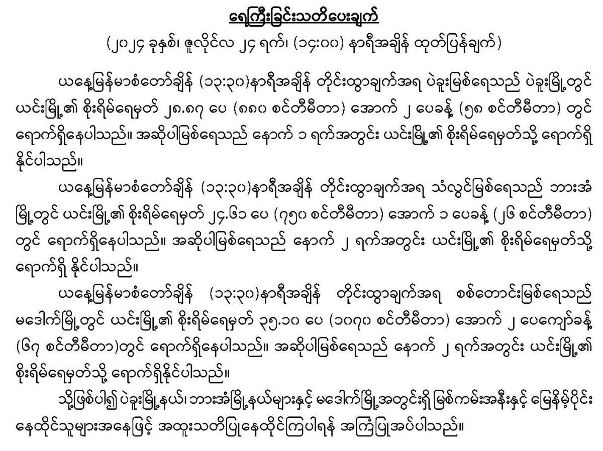 ၂-၅-၂၀၂၆:ဘင်္ဂလားပင်လယ်အော်မြောက်ပိုင်းနှင့် အလယ်ပိုင်းတို့တွင် အများအားဖြင့် သာယာနေပြီး ကပ္ပလီပင်လယ်ပြင်တွင် တိမ်အနည်းငယ် ဖြစ်ထွန်းနေကာ ကျန်ဘင်္ဂလားပင်လယ်အော်တွင် တိမ်အသင့်အတင့် ဖြစ်ထွန်းနေပါသည်။