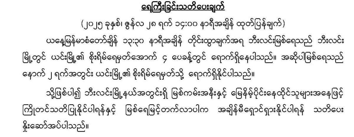၂၇-၁၀-၂၀၂၅: ယနေ့မြန်မာစံတော်ချိန် ၁၅:၃၀ နာရီအချိန် တိုင်းထွာချက်များအရ ဘင်္ဂလားပင်လယ်အော် အနောက်တောင်ပိုင်းနှင့် ယင်းနှင့်ဆက်စပ်လျက်ရှိသော ဘင်္ဂလားပင်လယ်အော်အနောက်အလယ်ပိုင်းတို့တွင် ဖြစ်ပေါ်နေသော ဆိုင်ကလုန်းမုန်တိုင်း “မွန်ထာ” (MONTHA) သည် အနောက်မြောက်ဘက်သို့ ရွေ့လျားခဲ့ပြီး ဆက်လက်တည်ရှိနေပါသည်။ အဆိုပါ ဆိုင်ကလုန်းမုန်တိုင်း “မွန်ထာ” သည် မြန်မာနိုင်ငံ၊ ကိုကိုးကျွန်းမြို့ (Coco Island) ၏ အနောက်-အနောက်တောင်ဘက် ရေမိုင် ၅၃၀ မိုင်ခန့်၊ အိန္ဒိယနိုင်ငံ၊ ချင်းနိုင်မြို့ (Chennai) ၏ အရှေ့ဘက် ရေမိုင် ၂၄၀ မိုင်ခန့်၊ ကာကီနာဒါမြို့ (Kakinada) ၏ အရှေ့ တောင်ဘက် ရေမိုင် ၂၆၀ မိုင်ခန့်အကွာ ပင်လယ်ပြင်ကို ဗဟိုပြုနေပါသည်။ အဆိုပါ ဆိုင်ကလုန်းမုန်တိုင်း “မွန်ထာ” သည် မြောက်- အနောက်မြောက်ဘက်သို့ ရွေ့လျားနိုင်ပြီး ၂၈-၁၀-၂၀၂၅ ရက်နေ့၌ အားကောင်းသောဆိုင်ကလုန်းမုန်တိုင်း (Severe Cyclonic Storm) အဖြစ်သို့ ရောက်ရှိနိုင်ကာ ယင်းနေ့ညပိုင်းတွင် အင်ဒရာပရာဒေ့ရှ်ကမ်းခြေကို ဖြတ်ကျော်နိုင်သည်ဟု ခန့်မှန်းရပါသည်။ ကပ္ပလီ ပင်လယ်ပြင်၊ ဘင်္ဂလားပင်လယ်အော်မြောက်ပိုင်းနှင့် အရှေ့အလယ်ပိုင်းတို့တွင် တိမ်အနည်းငယ်မှ တိမ်အသင့်အတင့် ဖြစ်ထွန်း နေပြီး ကျန်ဘင်္ဂလားပင်လယ်အော်တွင် တိမ်ထူထပ်နေပါသည်။