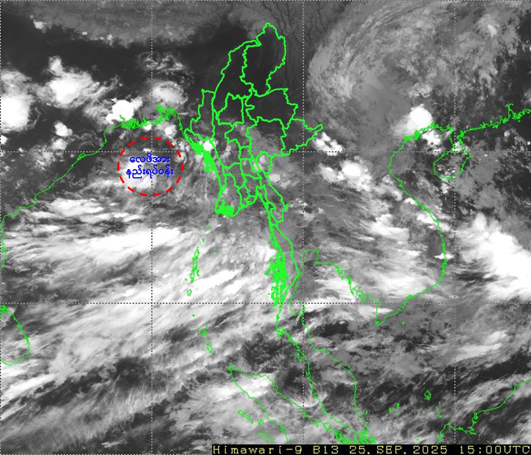 ယနေ့မြန်မာစံတော်ချိန် ၂၁:၃၀ နာရီအချိန် တိုင်းထွာချက်များအရ ဘင်္ဂလားပင်လယ်အော်မြောက်ပိုင်း နှင့် ယင်းနှင့်ဆက်စပ်လျက်ရှိသော ဘင်္ဂလားပင်လယ်အော်အလယ်ပိုင်းတို့တွင် လေဖိအားနည်းရပ်ဝန်း (Low Pressure Area) တစ်ခု ဖြစ်ပေါ်နေပါသည်။ အဆိုပါ လေဖိအားနည်းရပ်ဝန်းသည် အနောက် ဘက်သို့ ရွေ့လျားနိုင်ပြီး ဘင်္ဂလားပင်လယ်အော်အနောက်မြောက်ပိုင်းနှင့် ယင်းနှင့်ဆက်စပ်လျက် ရှိသော ဘင်္ဂလားပင်လယ်အော်အနောက်အလယ်ပိုင်း(အိန္ဒိယနိုင်ငံ၊ ဩရိဿပြည်နယ်တောင်ပိုင်း ကမ်းလွန်-အင်ဒရာပရာဒေ့ရှ်မြောက်ပိုင်းကမ်းခြေ)တို့တွင် ၂၆-၉-၂၀၂၅ ရက်နေ့၌ မုန်တိုင်းငယ်အဖြစ်သို့ ပိုမိုအားကောင်းလာနိုင်ကာ ၂၇-၉-၂၀၂၅ ရက်နေ့တွင် ဩရိဿပြည်နယ်တောင်ပိုင်း-အင်ဒရာပရာဒေ့ရှ် မြောက်ပိုင်းကမ်းခြေတို့ကို ဖြတ်ကျော်နိုင်သည်ဟု ခန့်မှန်းရပါသည်။