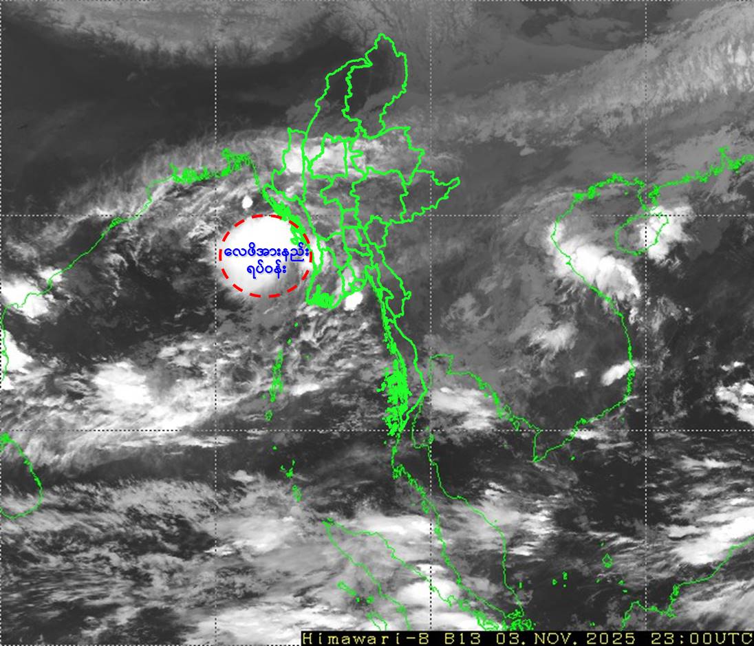 ယနေ့မြန်မာစံတော်ချိန် ၀၅:၃၀ နာရီအချိန် တိုင်းထွာချက်များအရ ဘင်္ဂလားပင်လယ်အော်အရှေ့ အလယ်ပိုင်းနှင့် ယင်းနှင့်ဆက်စပ်လျက်ရှိသော မြန်မာနိုင်ငံ၊ မြစ်ဝကျွန်းပေါ်ကမ်းရိုးတန်းဒေသအနီး တွင် ဖြစ်ပေါ်နေသော လေဖိအားနည်းရပ်ဝန်း (Low Pressure Area) သည်  မြောက်-အနောက် မြောက်ဘက်သို့ ရွေ့လျားခဲ့ပြီး ဘင်္ဂလားပင်လယ်အော်အရှေ့အလယ်ပိုင်းနှင့် ယင်းနှင့်ဆက်စပ်လျက် ရှိသော ဘင်္ဂလားပင်လယ်အော်အရှေ့မြောက်ပိုင်း၊ မြန်မာနိုင်ငံ၊ ရခိုင်ကမ်းရိုးတန်းနှင့် ယင်းနှင့် ဆက်စပ်လျက်ရှိသော မြစ်ဝကျွန်းပေါ် ကမ်းလွန်ဒေသများသို့ ရောက်ရှိခဲ့ပါသည်။ အဆိုပါ လေဖိအားနည်း ရပ်ဝန်းသည် မြောက်-အနောက်မြောက်ဘက်သို့ ဆက်လက်ရွေ့လျားနိုင်ပြီး ၅-၁၁-၂၀၂၅ ရက်နေ့ တွင် ဘင်္ဂလားပင်လယ်အော်အရှေ့မြောက်ပိုင်းနှင့် ယင်းနှင့်ဆက်စပ်လျက်ရှိသော မြန်မာနိုင်ငံ၊ ရခိုင် ကမ်းရိုးတန်းနှင့် ဘင်္ဂလားဒေ့ရှ်နိုင်ငံ ကမ်းရိုးတန်းဒေသများသို့ ရောက်ရှိနိုင်သည်ဟု ခန့်မှန်းရပါသည်။