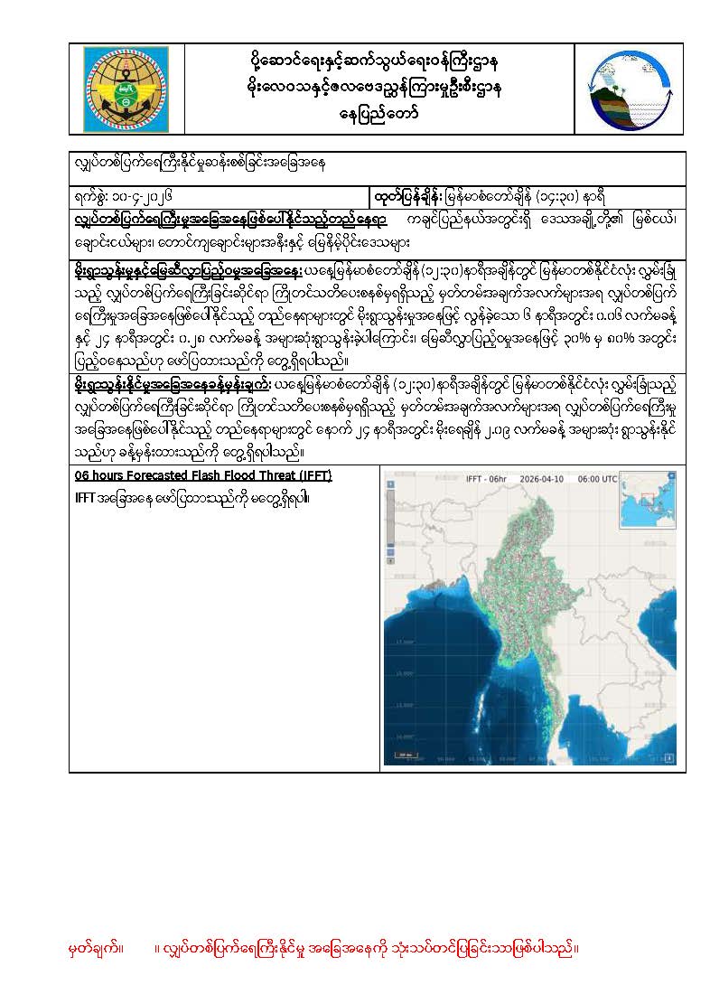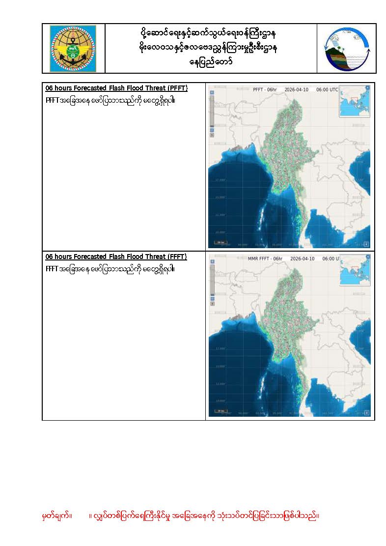 (၁၄-၄-၂၀၂၆) ဘင်္ဂလားပင်လယ်အော်အနောက်တောင်ပိုင်းတွင် တိမ်ထူထပ်နေပြီး ကပ္ပလီ ပင်လယ်ပြင်တောင်ပိုင်းနှင့် ဘင်္ဂလားပင်လယ်အော်အရှေ့တောင်ပိုင်းတို့တွင် တိမ်အနည်းငယ်မှ တိမ်အသင့် အတင့် ဖြစ်ထွန်းနေကာ ကပ္ပလီပင်လယ်ပြင်မြောက်ပိုင်းနှင့် ကျန်ဘင်္ဂလားပင်လယ်အော်တို့တွင် အများအားဖြင့် သာယာနေပါသည်။
