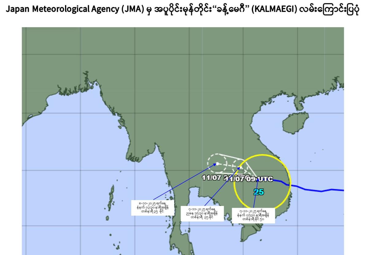 ယနေ့မြန်မာစံတော်ချိန် ၀၅:၃၀ နာရီအချိန် တိုင်းထွာချက်များအရ ဗီယက်နမ်နိုင်ငံကမ်းခြေ ကို ဒါနန်းမြို့၏ တောင်ဘက်(ကွီညန်းမြို့အနီး)မှ ဖြတ်ကျော်ခဲ့သော တိုင်ဖွန်းမုန်တိုင်း “ခန့်မေဂီ” (KALMAEGI)သည် ယမန်နေ့ညက ဗီယက်နမ်နိုင်ငံနှင့် လာအိုနိုင်ငံနယ်စပ် ဒေသတို့တွင် အားကောင်းသောအပူပိုင်းမုန်တိုင်း “ခန့်မေဂီ” အဖြစ်သို့ အားလျော့သွား ခဲ့ပါသည်။ အဆိုပါ အားကောင်းသောအပူပိုင်းမုန်တိုင်း “ခန့်မေဂီ”သည် အနောက်ဘက်သို့ ရွေ့လျားခဲ့ပြီး ယနေ့နံနက်ပိုင်းတွင် အပူပိုင်းမုန်တိုင်း “ခန့်မေဂီ” အဖြစ်သို့ အားလျော့ သွားခဲ့ကာ လာအိုနိုင်ငံကုန်းတွင်းပိုင်းဒေသများကို ဆက်လက်ဖြတ်ကျော်လျက်ရှိပါသည်။