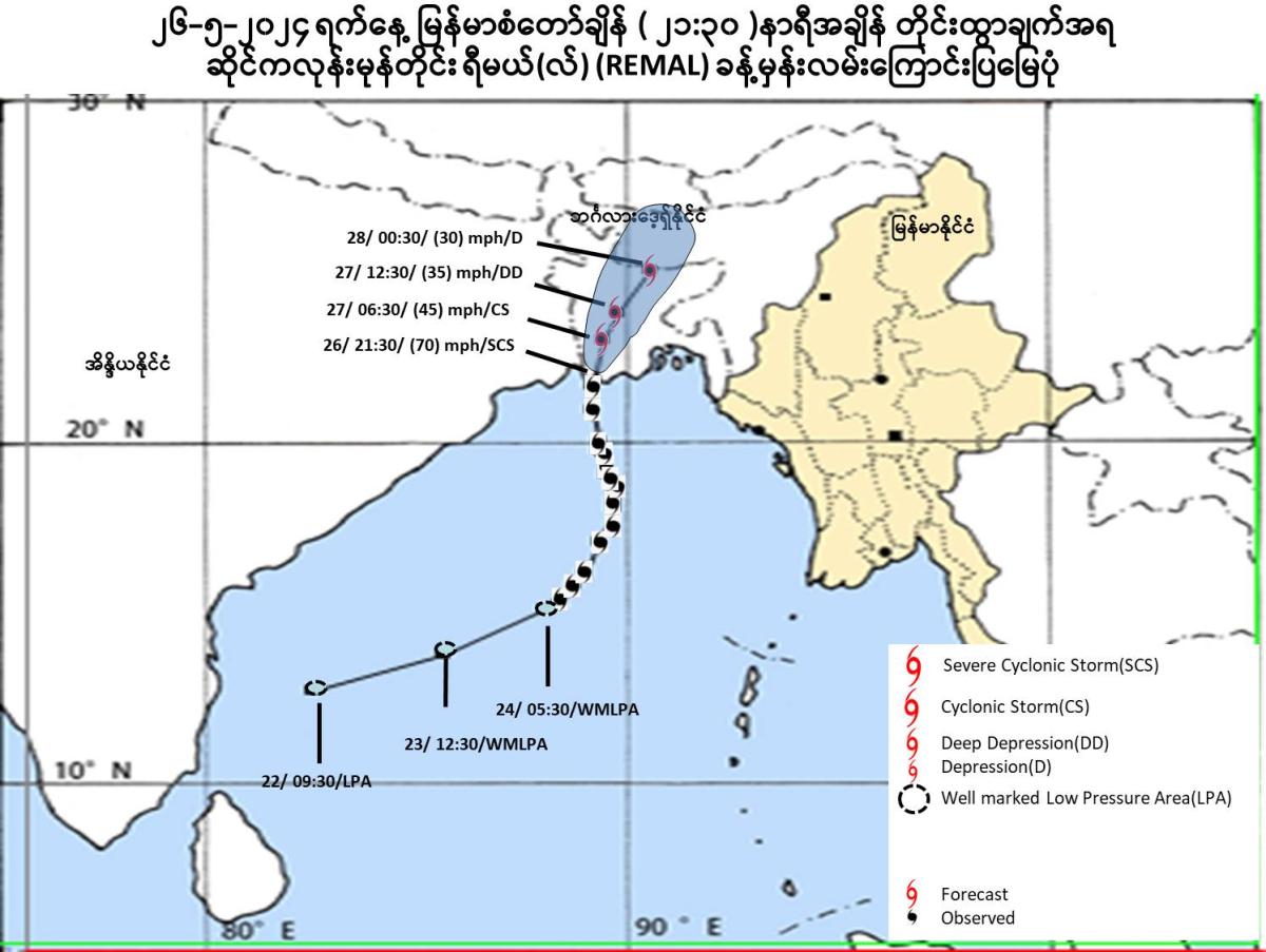 (၁) ယနေ့မြန်မာစံတော်ချိန် (၂၁:၃၀)နာရီအချိန် တိုင်းထွာချက်များအရ ဘင်္ဂလား ပင်လယ်အော်မြောက်ပိုင်းတွင် ဖြစ်ပေါ်နေသော အားကောင်းသောဆိုင်ကလုန်း မုန်တိုင်း(Severe Cyclonic Storm)“ရီမယ်(လ်)”(REMAL)သည် မြောက်ယွန်း ယွန်းသို့ ဆက်လက်ရွေ့လျားခဲ့ပြီး၊ မြန်မာနိုင်ငံ၊ မောင်တောမြို့(Maungdaw)၏ အနောက်-အနောက်မြောက်ဘက် ရေမိုင် ၁၈၀ မိုင်ခန့်၊ စစ်တွေမြို့(Sittwe) ၏ အနောက်-အနောက်မြောက်ဘက် ရေမိုင် ၂၂၀ မိုင်ခန့်၊ ဘင်္ဂလားဒေ့ရှ်နိုင်ငံ၊ ခီပူပါရာမြို့ (Khepupara)၏ အနောက်တောင်ဘက် ရေမိုင် ၆၅ မိုင်ခန့်၊ မွန်ဂလမြို့(Mongla)၏ တောင်-အနောက်တောင်ဘက် ရေမိုင် ၇၀ မိုင်ခန့်၊ အိန္ဒိယနိုင်ငံ၊ အနောက်ဘင်္ဂလားပြည်နယ်၊ ဆာဂါကျွန်း(Sagar Island)၏ အရှေ့-အရှေ့တောင်ဘက် ရေမိုင် ၆၅ မိုင်ခန့်၊ ဒီဂါမြို့(Digha)၏ အရှေ့-အရှေ့တောင်ဘက် ရေမိုင် ၉၅ မိုင်ခန့်နှင့် ကန်နင်းမြို့(Canning)၏ တောင်-အရှေ့တောင်ဘက် ရေမိုင် ၆၀ မိုင်ခန့်အကွာ ပင်လယ်ပြင်ကို ဗဟိုပြုနေပါသည်။