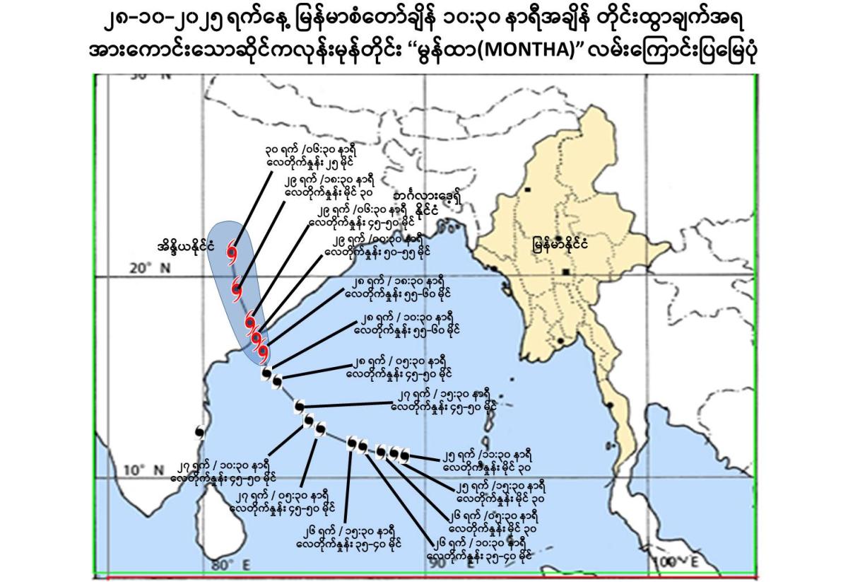 (၁)     ယနေ့မြန်မာစံတော်ချိန် ၁၀:၃၀ နာရီအချိန် တိုင်းထွာချက်များအရ ဘင်္ဂလား ပင်လယ်အော်အနောက်အလယ်ပိုင်းတွင် ဖြစ်ပေါ်နေသော ဆိုင်ကလုန်းမုန်တိုင်း “မွန်ထာ” (MONTHA) သည် မြောက်-အနောက်မြောက်ဘက်သို့ ရွေ့လျားခဲ့ပြီး ပိုမိုအားကောင်းလာကာ အားကောင်းသောဆိုင်ကလုန်းမုန်တိုင်း (Severe Cyclonic Storm) “မွန်ထာ” (MONTHA) အဖြစ်သို့ ရောက်ရှိခဲ့ပါသည်။ အဆိုပါ  အားကောင်းသောဆိုင်ကလုန်းမုန်တိုင်း “မွန်ထာ” သည် မြန်မာနိုင်ငံ၊ ကိုကိုးကျွန်းမြို့ (Coco Island) ၏ အနောက်ဘက် ရေမိုင် ၆၁၀ မိုင်ခန့်၊ အိန္ဒိယနိုင်ငံ၊ ချင်းနိုင်မြို့ (Chennai) ၏ အရှေ့မြောက်ဘက် ရေမိုင် ၁၈၀ မိုင်ခန့်၊ ကာကီနာဒါမြို့ (Kakinada) ၏ တောင်-အရှေ့တောင်ဘက်‌ ရေမိုင် ၁၃၅ မိုင်ခန့်အကွာ ပင်လယ်ပြင်ကို ဗဟိုပြုနေပါသည်။