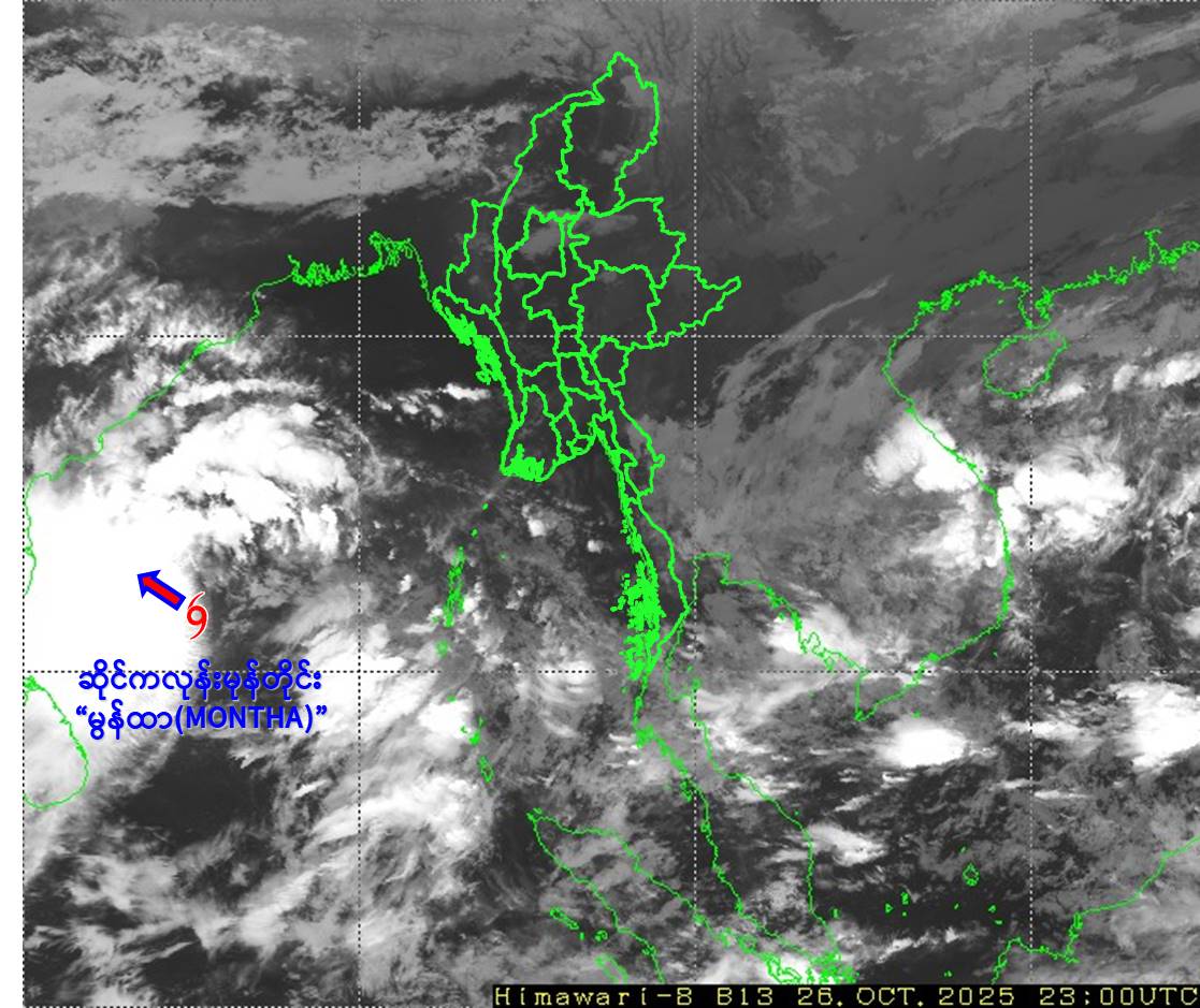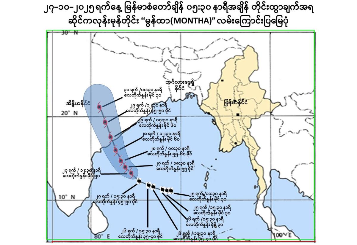 (၁) ယနေ့မြန်မာစံတော်ချိန် ၀၅:၃၀ နာရီအချိန် တိုင်းထွာချက်များအရ ဘင်္ဂလား ပင်လယ်အော်အရှေ့တောင်ပိုင်းတွင် ဖြစ်ပေါ်နေသော အားကောင်းသောမုန်တိုင်းငယ် (Deep Depression)သည် အနောက်-အနောက်မြောက်ဘက်သို့ ရွေ့လျားခဲ့ပြီး ပိုမိုအားကောင်းလာကာ ဘင်္ဂလားပင်လယ်အော်အနောက်တောင်ပိုင်းတွင် ဆိုင်ကလုန်း မုန်တိုင်း“မွန်ထာ”(MONTHA)အဖြစ်သို့ ရောက်ရှိခဲ့ပါသည်။ အဆိုပါ ဆိုင်ကလုန်း မုန်တိုင်း“မွန်ထာ”သည် မြန်မာနိုင်ငံ၊ ကိုကိုးကျွန်းမြို့(Coco Island)၏ အနောက်- အနောက်တောင်ဘက် ရေမိုင် ၄၈၅ မိုင်ခန့်၊ အိန္ဒိယနိုင်ငံ၊ ချင်းနိုင်မြို့(Chennai)၏ အရှေ့-အရှေ့တောင်ဘက် ရေမိုင် ၃၁၀ မိုင်ခန့်၊ ကာကီနာဒါမြို့(Kakinada)၏ အရှေ့တောင်ဘက် ရေမိုင် ၃၅၀ မိုင်ခန့်အကွာ ပင်လယ်ပြင်ကို ဗဟိုပြုနေပါသည်။