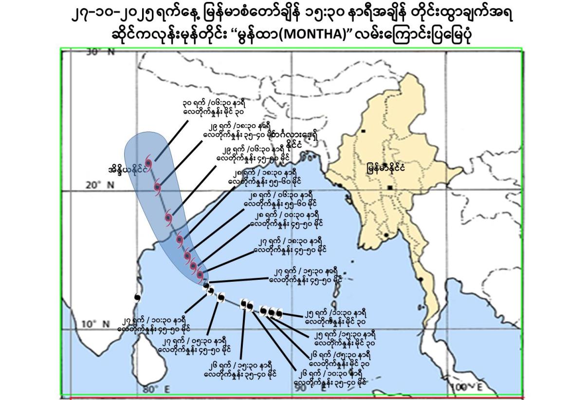 (၁)     ယနေ့မြန်မာစံတော်ချိန် ၁၅:၃၀ နာရီအချိန် တိုင်းထွာချက်များအရ  ဘင်္ဂလား ပင်လယ်အော်အနောက်တောင်ပိုင်းနှင့် ယင်းနှင့်ဆက်စပ်လျက်ရှိသော ဘင်္ဂလား ပင်လယ်အော်အနောက်အလယ်ပိုင်းတွင် ဖြစ်ပေါ်နေသော ဆိုင်ကလုန်းမုန်တိုင်း “မွန်ထာ” (MONTHA) သည် အနောက်မြောက်ဘက်သို့ ရွေ့လျားခဲ့ပြီး ဆက်လက် တည်ရှိနေပါသည်။ အဆိုပါ ဆိုင်ကလုန်းမုန်တိုင်း “မွန်ထာ” သည် မြန်မာနိုင်ငံ၊ ကိုကိုးကျွန်းမြို့ (Coco Island) ၏ အနောက်-အနောက်တောင်ဘက် ရေမိုင် ၅၃၀ မိုင်ခန့်၊ အိန္ဒိယနိုင်ငံ၊ ချင်းနိုင်မြို့ (Chennai) ၏ အရှေ့ဘက် ရေမိုင် ၂၄၀ မိုင်ခန့်၊ ကာကီနာဒါမြို့ (Kakinada) ၏ အရှေ့တောင်ဘက်‌ ရေမိုင် ၂၆၀ မိုင်ခန့် အကွာ ပင်လယ်ပြင်ကို ဗဟိုပြုနေပါသည်။