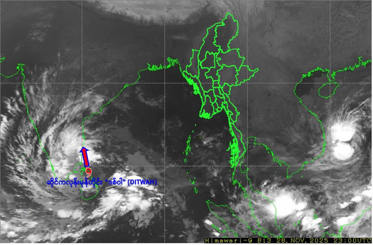 (၁) ယနေ့မြန်မာစံတော်ချိန် ၀၅:၃၀ နာရီအချိန် တိုင်းထွာချက်များအရ သီရိလင်္ကာ နိုင်ငံ၊ ထရီကိုမာလီမြို့(Trincomalee)အနီးမှ ဖြတ်ကျော်ခဲ့သော ဆိုင်ကလုန်း မုန်တိုင်း“ဒစ်ဝါ”(DITWAH)သည် မြောက်-အနောက်မြောက်ဘက်သို့ရွေ့လျားခဲ့ပြီး မြန်မာနိုင်ငံ၊ ကိုကိုးကျွန်းမြို့(Coco Island)၏ အနောက်-အနောက်တောင်ဘက် ရေမိုင် ၇၉၅ မိုင်ခန့်၊ အိန္ဒိယနိုင်ငံ၊ ပူဒူချယ်ရီမြို့(Puducherry)၏ တောင်-အရှေ့ တောင်ဘက် ရေမိုင် ၁၇၅ မိုင်ခန့်နှင့် သီရိလင်္ကာနိုင်ငံ၊ ထရီကိုမာလီမြို့(Trincomalee) ၏ မြောက်-အနောက်မြောက်ဘက် ရေမိုင် ၄၅ မိုင်ခန့်အကွာ ပင်လယ်ပြင်ကို ဗဟိုပြုနေပါသည်။