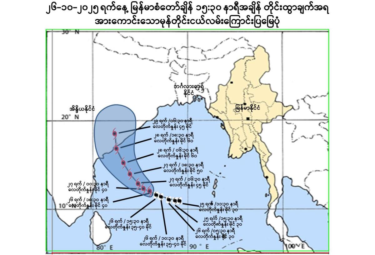 (၁) ယနေ့မြန်မာစံတော်ချိန် ၁၅:၃၀ နာရီအချိန် တိုင်းထွာချက်များအရ ဘင်္ဂလား ပင်လယ်အော်အရှေ့တောင်ပိုင်းတွင် ဖြစ်ပေါ်နေသော အားကောင်းသောမုန်တိုင်းငယ် (Deep Depression)သည် အနောက်-အနောက်မြောက်ဘက်သို့ ရွေ့လျားခဲ့ပြီး ဆက်လက်တည်ရှိနေပါသည်။ အဆိုပါ အားကောင်းသောမုန်တိုင်းငယ်သည် မြန်မာ နိုင်ငံ၊ ကိုကိုးကျွန်းမြို့(Coco Island)၏ အနောက်တောင်ဘက် ရေမိုင် ၄၁၅ မိုင်ခန့်၊ အိန္ဒိယနိုင်ငံ၊ ချင်းနိုင်မြို့(Chennai)၏ အရှေ့-အရှေ့တောင်ဘက် ရေမိုင် ၄၀၅ မိုင်ခန့်၊ ကာကီနာဒါမြို့(Kakinada)၏ အရှေ့တောင်ဘက် ရေမိုင် ၄၃၀ မိုင်ခန့် အကွာ ပင်လယ်ပြင်ကို ဗဟိုပြုနေပါသည်။