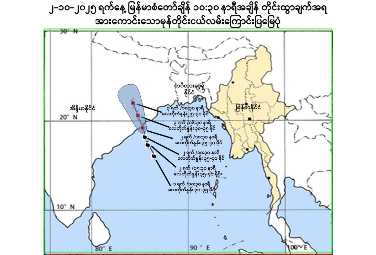 (၁) ယနေ့မြန်မာစံတော်ချိန် ၁၀:၃၀ နာရီအချိန် တိုင်းထွာချက်များအရ ဘင်္ဂလား ပင်လယ်အော်အနောက်အလယ်ပိုင်းနှင့် ယင်းနှင့်ဆက်စပ်လျက်ရှိသော ဘင်္ဂလား ပင်လယ်အော်အနောက်မြောက်ပိုင်းတို့တွင် ဖြစ်ပေါ်နေသော အားကောင်းသော မုန်တိုင်းငယ်(Deep Depression)သည် မြောက်-အနောက်မြောက်ဘက်သို့ ရွေ့လျားခဲ့ပြီး မြန်မာနိုင်ငံ၊ စစ်တွေမြို့(Sittwe)၏ အနောက်-အနောက်တောင် ဘက် ရေမိုင် ၄၃၅ မိုင်ခန့်၊ အိန္ဒိယနိုင်ငံ၊ ပူရီမြို့(Puri)၏ တောင်-အနောက် တောင်ဘက် ရေမိုင် ၁၀၅ မိုင်ခန့်၊ ဂိုလ်ပါပူမြို့ (Gopalpur)၏ တောင်-အရှေ့ တောင်ဘက် ရေမိုင် ၈၀ မိုင်ခန့်နှင့် ပါရာဒစ်ပ်မြို့ (Paradip)၏ တောင်-အနောက် တောင်ဘက် ရေမိုင် ၁၄၅ မိုင်ခန့်အကွာ ပင်လယ်ပြင်ကို ဗဟိုပြုနေပါသည်။