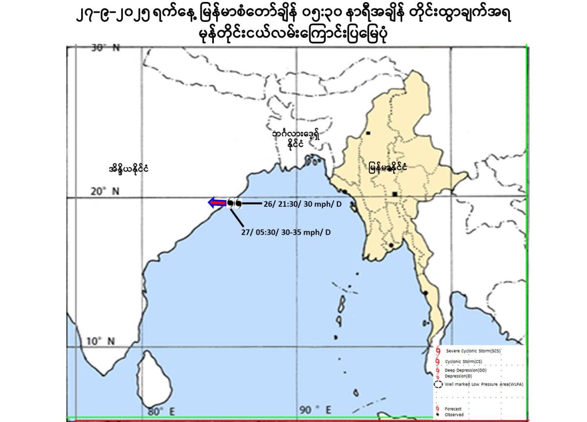 (၁) ယနေ့မြန်မာစံတော်ချိန် ၀၅:၃၀ နာရီအချိန် တိုင်းထွာချက်များအရ ဘင်္ဂလား ပင်လယ်အော်အနောက်မြောက်ပိုင်းနှင့် ယင်းနှင့်ဆက်စပ်လျက်ရှိသော ဘင်္ဂလား ပင်လယ်အော်အနောက်အလယ်ပိုင်း(အိန္ဒိယနိုင်ငံ၊ ဩရိဿပြည်နယ်တောင်ပိုင်း ကမ်းလွန်-အင်ဒရာပရာဒေ့ရှ်မြောက်ပိုင်းကမ်းခြေ)တို့တွင် ဖြစ်ပေါ်နေသော မုန်တိုင်းငယ်(Depression)သည် အနောက်ဘက်သို့ရွေ့လျားခဲ့ပြီး ဘင်္ဂလား ပင်လယ်အော်အနောက်မြောက်ပိုင်း(အိန္ဒိယနိုင်ငံ၊ ဩရိဿပြည်နယ်တောင်ပိုင်း ကမ်းခြေအနီး)သို့ရောက်ရှိခဲ့ကာ မြန်မာနိုင်ငံ၊ စစ်တွေမြို့(Sittwe)၏ အနောက်- အနောက်တောင်ဘက် ရေမိုင် ၄၂၀ မိုင်ခန့်၊ အိန္ဒိယနိုင်ငံ၊ ပူရီမြို့(Puri)၏ အနောက် တောင်ဘက် ရေမိုင် ၃၅ မိုင်ခန့်၊ ဂိုလ်ပါပူမြို့(Gopalpur)၏ အရှေ့ဘက် ရေမိုင် ၃၅ မိုင်ခန့်နှင့် ကာလင်ဂါပတ္တနမ်မြို့(Kalingapatnam)၏ အရှေ့မြောက်ဘက် ရေမိုင် ၁၀၀ မိုင်ခန့်အကွာ ပင်လယ်ပြင်ကို ဗဟိုပြုနေပါသည်။
