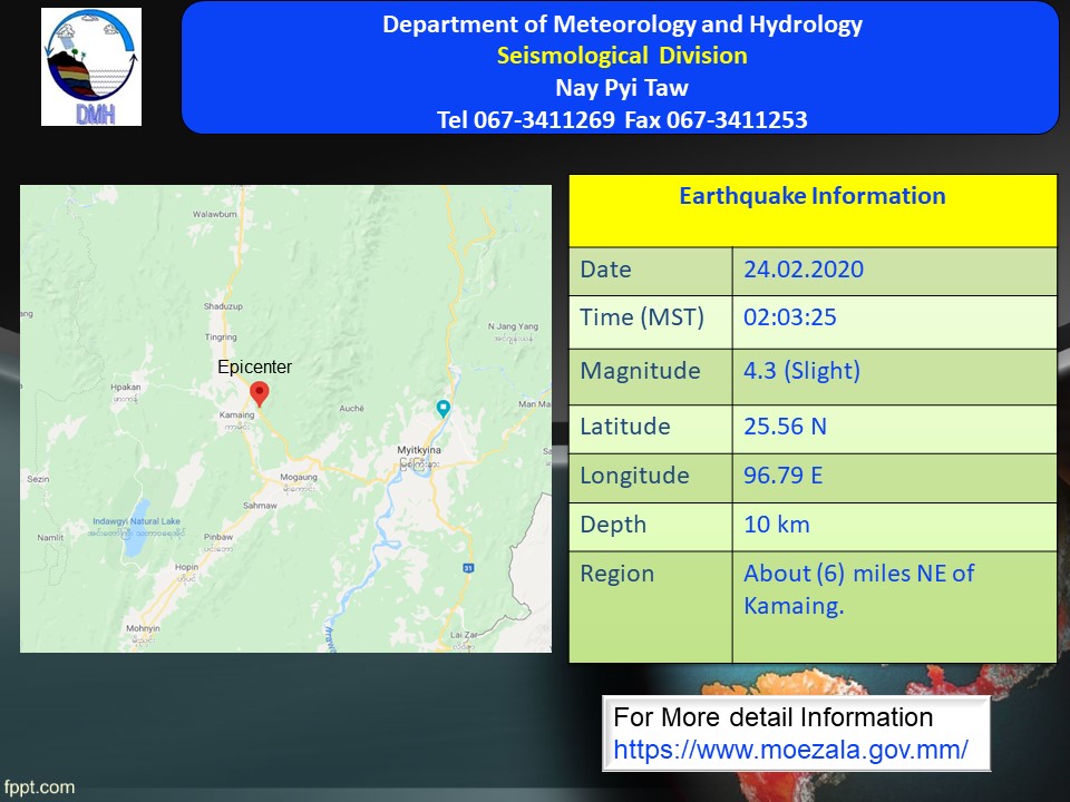 ၂၀၂၀ ပြည့်နှစ်၊ ဖေဖော်ဝါရီလ (၂၄)ရက်နေ့၊ မြန်မာစံတော်ချိန် (၀၂)နာရီ၊ (၀၃)မိနစ်၊ (၂၅)စက္ကန့် အချိန်တွင် မြစ်ကြီးနားမြေငလျင်စခန်းမှ အနောက်ဘက် (၄၃)မိုင် ခန့်ကွာဝေးသော မြန်မာနိုင်ငံ ပြည်တွင်း (ကာမိုင်းမြို့၏ အရှေ့မြောက်ဘက် (၆)မိုင် ခန့်အကွာ)၊ မြောက်လတ္တီတွဒ် (၂၅.၅၆) ဒီဂရီ၊ အရှေ့လောင်ဂျီတွဒ် (၉၆.၇၉)ဒီဂရီ၊ အနက် (၁၀) ကီလိုမီတာကို ဗဟိုပြု၍ အင်အားရစ်(ခ်)တာ စကေး (၄.၃)အဆင့်ရှိ အင်အားအနည်းငယ်ရှိသော မြေငလျင်တစ်ခု လှုပ်ရှားသွားကြောင်း တိုင်းထွာ ရရှိပါသည်။