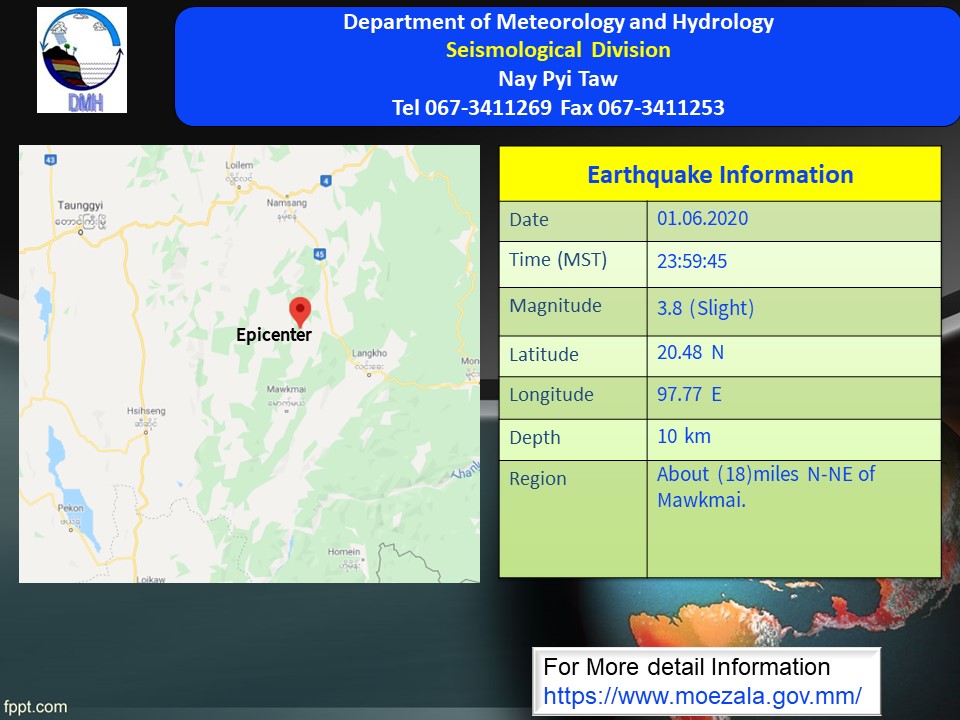 ၂၀၂၀ ပြည့်နှစ်၊ ဇွန်လ (၁)ရက်နေ့၊ မြန်မာစံတော်ချိန် (၂၃)နာရီ၊ (၅၉)မိနစ်၊ (၄၅)စက္ကန့် အချိန်တွင် နမ့်စန်မြေငလျင်စခန်းမှ တောင်ဘက် (၂၉)မိုင်ခန့်ကွာဝေးသော မြန်မာနိုင်ငံပြည်တွင်း (မောက်မယ်မြို့၏ မြောက်-အရှေ့မြောက်ဘက် (၁၈)မိုင်ခန့်အကွာ) မြောက်လတ္တီတွဒ် (၂၀.၄၈) ဒီဂရီ၊ အရှေ့လောင်ဂျီတွဒ် (၉၇.၇၇)ဒီဂရီ၊ အနက် (၁၀)ကီလိုမီတာကို ဗဟိုပြု၍ အင်အားရစ်(ခ်) တာစကေး (၃.၈) အဆင့်ရှိ အင်အားအနည်းငယ်ရှိသော မြေငလျင်တစ်ခု လှုပ်ရှားသွားကြောင်း တိုင်းထွာရရှိပါသည်။