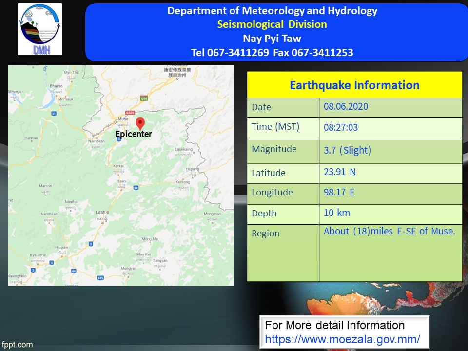 ၂၀၂၀ ပြည့်နှစ်၊ ဇွန်လ (၈)ရက်နေ့၊ မြန်မာစံတော်ချိန် (၀၈)နာရီ၊ (၂၇)မိနစ်၊ (၀၃)စက္ကန့် အချိန်တွင် သီပေါမြေငလျင်စခန်းမှ အရှေ့မြောက်ဘက် (၁၀၅)မိုင်ခန့်ကွာဝေးသော မြန်မာနိုင်ငံ ပြည်တွင်း (မူဆယ်မြို့၏ အရှေ့-အရှေ့တောင်ဘက် (၁၈)မိုင်ခန့်အကွာ) မြောက်လတ္တီတွဒ် (၂၃.၉၁)ဒီဂရီ၊ အရှေ့လောင်ဂျီတွဒ် (၉၈.၁၇)ဒီဂရီ၊ အနက် (၁၀)ကီလိုမီတာကို ဗဟိုပြု၍ အင်အားရစ်(ခ်)တာစကေး (၃.၇) အဆင့်ရှိ အင်အားအနည်းငယ်ရှိသော မြေငလျင်တစ်ခု လှုပ်ရှားသွားကြောင်း တိုင်းထွာရရှိပါသည်။