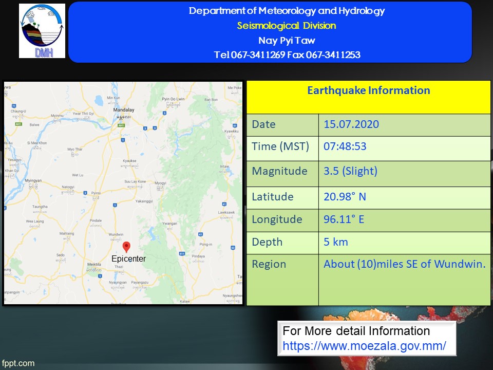 ၂၀၂၀ ပြည့်နှစ်၊ ဇူလိုင်လ (၁၅)ရက်နေ့၊ မြန်မာစံတော်ချိန် (၀၇)နာရီ၊ (၄၈)မိနစ်၊ (၅၃)စက္ကန့် အချိန်တွင် မန္တလေးမြေငလျင်စခန်းမှ တောင်ဘက် (၇၁)မိုင် ခန့်ကွာဝေးသော မြန်မာနိုင်ငံ ပြည်တွင်း (ဝမ်းတွင်းမြို့၏ အရှေ့တောင်ဘက် (၁၀)မိုင် ခန့်အကွာ) မြောက်လတ္တီတွဒ် (၂၀.၉၈)ဒီဂရီ၊ အရှေ့လောင်ဂျီတွဒ် (၉၆.၁၁)ဒီဂရီ၊ အနက် (၅)ကီလိုမီတာကို ဗဟိုပြု၍ အင်အား ရစ်(ခ်)တာစကေး (၃.၅) အဆင့်ရှိ အင်အားအနည်းငယ်ရှိသော မြေငလျင်တစ်ခု လှုပ်ရှားသွား ကြောင်း တိုင်းထွာရရှိ ပါသည်။
