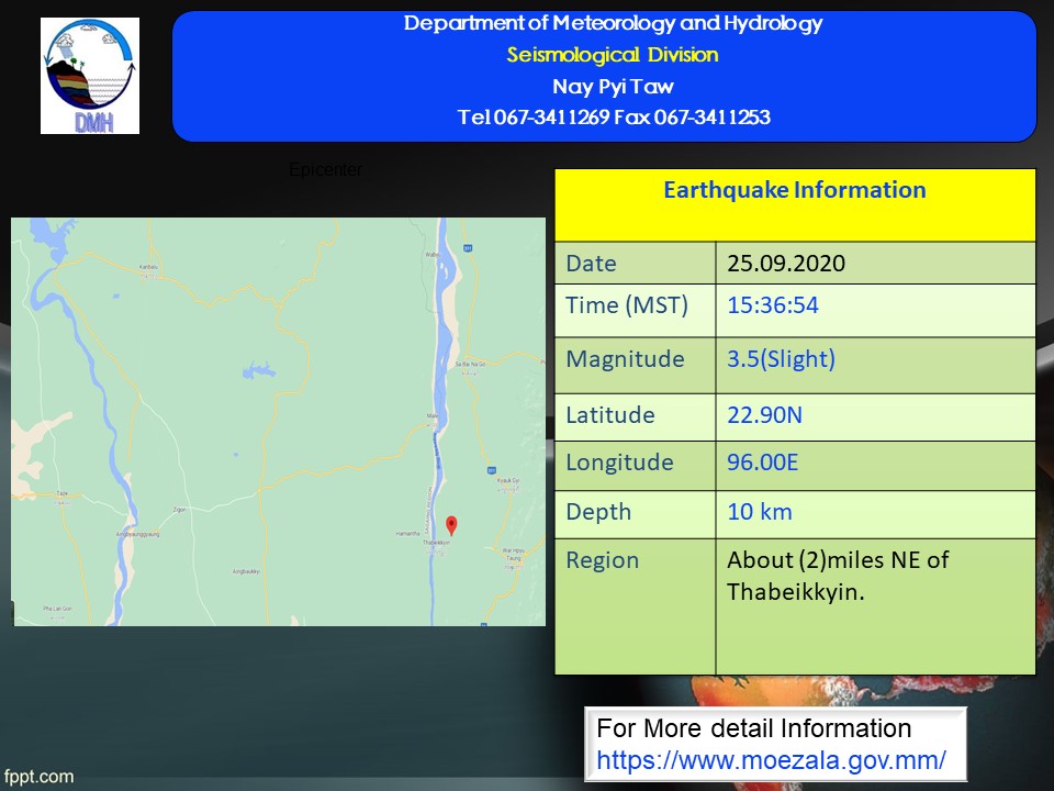 ၂၀၂၀ ပြည့်နှစ်၊ စက်တင်ဘာလ (၂၅)ရက်နေ့၊ မြန်မာစံတော်ချိန် (၁၅)နာရီ၊ (၃၆)မိနစ်၊ (၅၄)စက္ကန့် အချိန်တွင် ကန့်ဘလူမြေငလျင်စခန်းမှ အရှေ့တောင်ဘက် (၃၇) မိုင်ခန့် ကွာဝေးသော၊ မြန်မာနိုင်ငံပြည်တွင်း (သပိတ်ကျင်းမြို့၏ အရှေ့မြောက်ဘက် (၂)မိုင်ခန့် အကွာ)၊ မြောက်လတ္တီတွဒ် (၂၂.၉၀) ဒီဂရီ၊ အရှေ့လောင်ဂျီတွဒ် (၉၆.၀၀)ဒီဂရီ၊ အနက် (၁၀)ကီလိုမီတာကို ဗဟိုပြု၍ အင်အားရစ်(ခ်)တာစကေး (၃.၅) အဆင့်ရှိ အင်အားအနည်းငယ်ရှိသော မြေငလျင် တစ်ခု လှုပ်ရှားသွားကြောင်း တိုင်းထွာရရှိပါသည်။