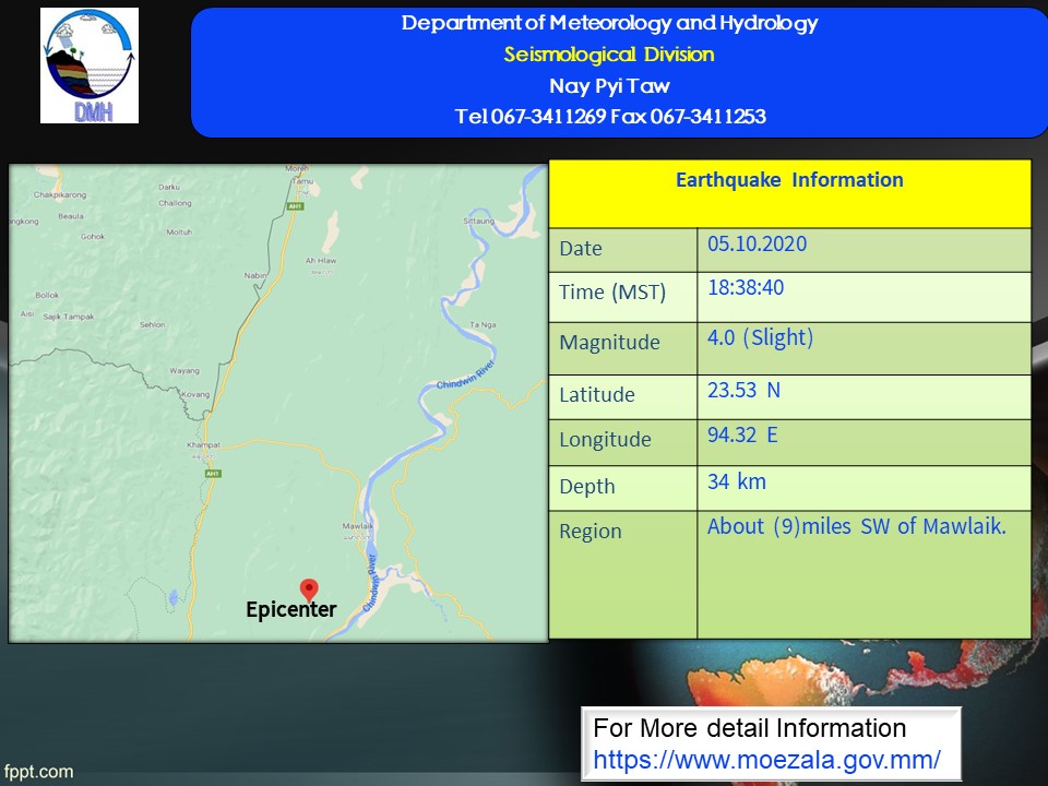 ၂၀၂၀ ပြည့်နှစ်၊ အောက်တိုဘာလ (၅) ရက်နေ့၊ မြန်မာစံတော်ချိန် (၁၈) နာရီ၊ (၃၈) မိနစ်၊ (၄၀) စက္ကန့် အချိန်တွင် တမူးမြေငလျင်စခန်းမှ တောင်ဘက် (၄၇)မိုင်ခန့်ကွာဝေးသော မြန်မာနိုင်ငံ ပြည်တွင်း (မော်လိုက်မြို့၏ အနောက်တောင်ဘက်(၉)မိုင် ခန့်အကွာ) မြောက်လတ္တီတွဒ် (၂၃.၅၃) ဒီဂရီ၊ အရှေ့လောင်ဂျီတွဒ် (၉၄.၃၂)ဒီဂရီ၊ အနက်(၃၄)ကီလိုမီတာ ကို ဗဟိုပြု၍ အင်အား ရစ်(ခ်)တာစကေး(၄.၀)အဆင့်ရှိ အင်အားအနည်းငယ်ရှိသောမြေငလျင်တစ်ခု လှုပ်ရှားသွား ကြောင်း တိုင်းထွာရရှိပါသည်။