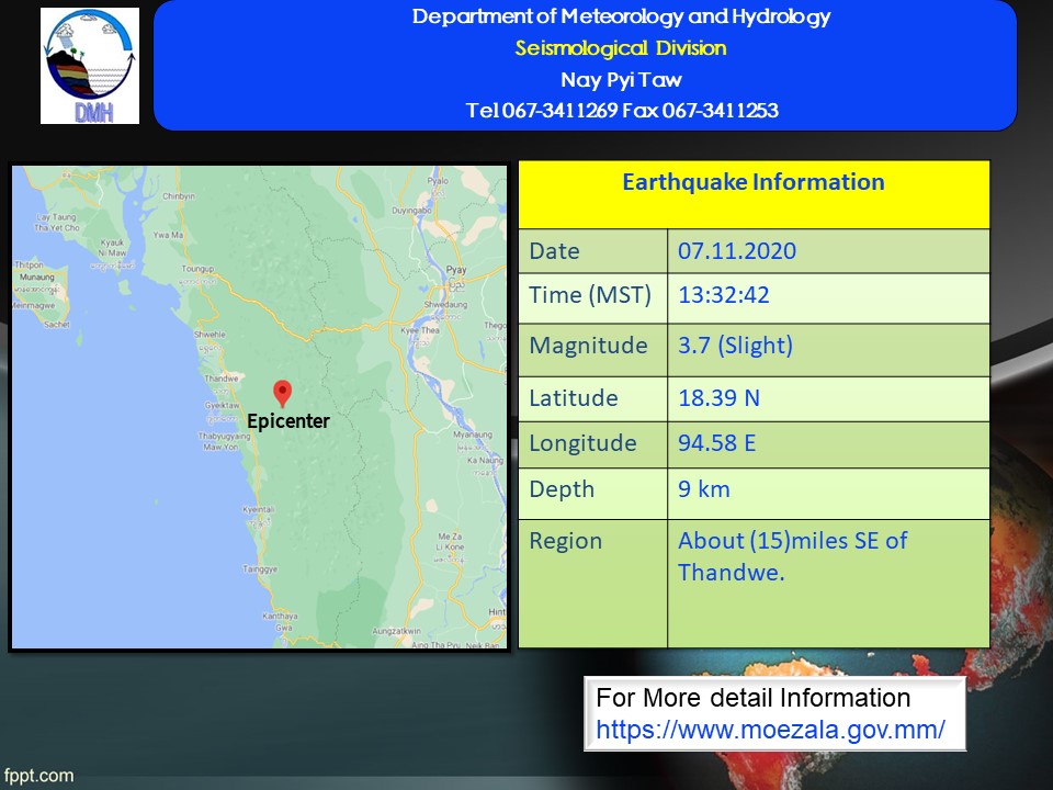 ၂၀၂၀ ပြည့်နှစ်၊ နိုဝင်ဘာလ (၇)ရက်နေ့၊ မြန်မာစံတော်ချိန် (၁၃)နာရီ၊ (၃၂)မိနစ်၊ (၄၂)စက္ကန့် အချိန်တွင် ဂွမြေငလျင်စခန်းမှ မြောက်ဘက် (၅၄)မိုင်ခန့် ကွာဝေးသော မြန်မာနိုင်ငံ ပြည်တွင်း (သံတွဲမြို့၏ အရှေ့တောင်ဘက် (၁၅)မိုင် ခန့်အကွာ)၊ မြောက်လတ္တီတွဒ် (၁၈.၃၉)ဒီဂရီ၊ အရှေ့လောင်ဂျီတွဒ် (၉၄.၅၈)ဒီဂရီ၊ အနက် (၉)ကီလိုမီတာကို ဗဟိုပြု၍ အင်အားရစ်(ခ်)တာ စကေး (၃.၇)အဆင့်ရှိ အင်အားအနည်းငယ်ရှိသော မြေငလျင်တစ်ခု လှုပ်ရှားသွားကြောင်း တိုင်းထွာရရှိပါသည်။