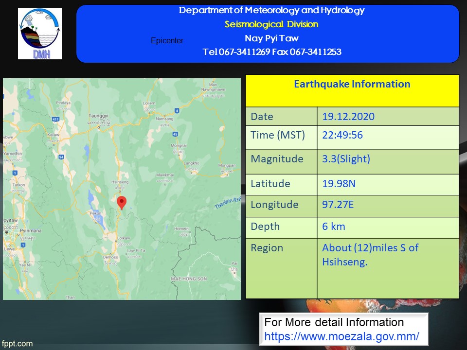 ၂၀၂၀ ပြည့်နှစ်၊ ဒီဇင်ဘာလ (၁၉) ရက်နေ့၊ မြန်မာစံတော်ချိန် (၂၂) နာရီ၊ (၄၉) မိနစ်၊ (၅၆) စက္ကန့် အချိန်တွင် တောင်ကြီးမြေငလျင်စခန်းမှ တောင်-အရှေ့တောင်ဘက် (၅၆) မိုင်ခန့် ကွာဝေးသော မြန်မာနိုင်ငံပြည်တွင်း (ဆီဆိုင်မြို့၏ တောင်ဘက် (၁၂)မိုင်ခန့်အကွာ)၊ မြောက်လတ္တီတွဒ် (၁၉.၉၈)ဒီဂရီ၊ အရှေ့လောင်ဂျီတွဒ် (၉၇.၂၇)ဒီဂရီ၊ အနက်(၆) ကီလိုမီတာကို ဗဟိုပြု၍ အင်အား ရစ်(ခ်)တာစကေး (၃.၃)အဆင့်ရှိ အင်အားအနည်းငယ်ရှိသော မြေငလျင်တစ်ခု လှုပ်ရှားသွား ကြောင်း တိုင်းထွာရရှိပါသည်။