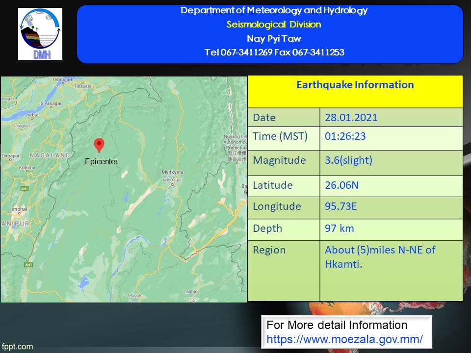 ၂၀၂၁ ခုနှစ်၊ ဇန်နဝါရီ(၂၈) ရက်နေ့၊ မြန်မာစံတော်ချိန် (၀၁)နာရီ(၂၆)မိနစ်(၂၃) စက္ကန့်အချိန်တွင် မြစ်ကြီးနာမြေငလျင်စခန်းမှ အနောက်-အနောက်မြောက်ဘက် (၁၁၅)မိုင် ခန့်ကွာဝေးသော မြန်မာနိုင်ငံ ပြည်တွင်း (ခန္တီးမြို့၏ မြောက်-အရှေ့မြောက်ဘက် (၅)မိုင်ခန့်အကွာ)၊ မြောက်လတ္တီတွဒ် (၂၆.၀၆)ဒီဂရီ၊ အရှေ့လောင်ဂျီတွဒ် (၉၅.၇၃)ဒီဂရီ၊ အနက်(၉၇)ကီလိုမီတာခန့်ကို ဗဟိုပြု၍ အင်အားရစ်(ခ်)တာစကေး (၃.၆)အဆင့်ရှိ အင်အားအနည်းငယ်ရှိသော မြေငလျင်တစ်ခု လှုပ်ရှား သွားကြောင်း တိုင်းထွာရရှိပါသည်။