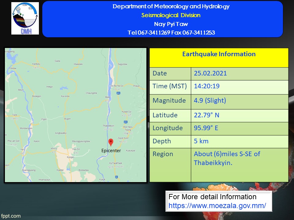 ၂၀၂၁ ခုနှစ်၊ ဖေဖော်ဝါရီလ (၂၅)ရက်နေ့၊ မြန်မာစံတော်ချိန် (၁၄)နာရီ၊ (၂၀)မိနစ်၊ (၁၉) စက္ကန့်အချိန်တွင် ကန့်ဘလူမြေငလျင်စခန်းမှ အရှေ့တောင်ဘက် (၄၂)မိုင် ခန့်ကွာဝေးသော မြန်မာနိုင်ငံ ပြည်တွင်း (သပိတ်ကျင်းမြို့၏ တောင်-အရှေ့တောင်ဘက် (၆)မိုင် ခန့်အကွာ) မြောက်လတ္တီတွဒ် (၂၂.၇၉)ဒီဂရီ၊ အရှေ့လောင်ဂျီတွဒ် (၉၅.၉၉)ဒီဂရီ၊ အနက် (၅)ကီလိုမီတာကို ဗဟိုပြု၍ အင်အားရစ်(ခ်)တာစကေး (၄.၉)အဆင့်ရှိ အင်အားအနည်းငယ်ရှိသော မြေငလျင်တစ်ခု လှုပ်ရှားသွားကြောင်း တိုင်းထွာရရှိပါသည်။
