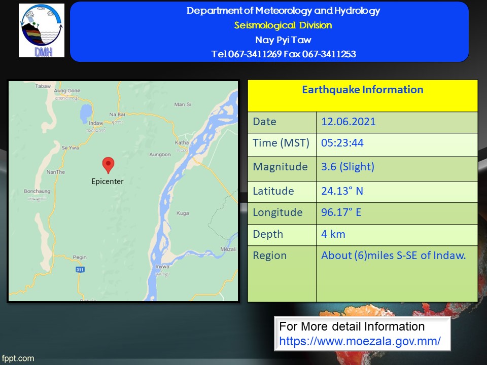 ၂၀၂၁ ခုနှစ်၊ ဇွန်လ (၁၂)ရက်နေ့၊ မြန်မာစံတော်ချိန် (၀၅)နာရီ၊ (၂၃)မိနစ်၊ (၄၄)စက္ကန့် အချိန်တွင် ကသာမြေငလျင်စခန်းမှ အနောက်-အနောက်တောင်ဘက် (၁၁)မိုင်ခန့်ကွာဝေးသော မြန်မာနိုင်ငံပြည်တွင်း (အင်းတော်မြို့၏ တောင်-အရှေ့တောင်ဘက် (၆)မိုင်ခန့်အကွာ) မြောက်လတ္တီတွဒ် (၂၄.၁၃)ဒီဂရီ၊ အရှေ့လောင်ဂျီတွဒ် (၉၆.၁၇)ဒီဂရီ၊ အနက် (၄)ကီလိုမီတာကို ဗဟိုပြု၍ အင်အား ရစ်(ခ်)တာစကေး (၃.၆)အဆင့်ရှိ အင်အားအနည်းငယ်ရှိသော မြေငလျင် တစ်ခု လှုပ်ရှားသွားကြောင်း တိုင်းထွာရရှိပါသည်။