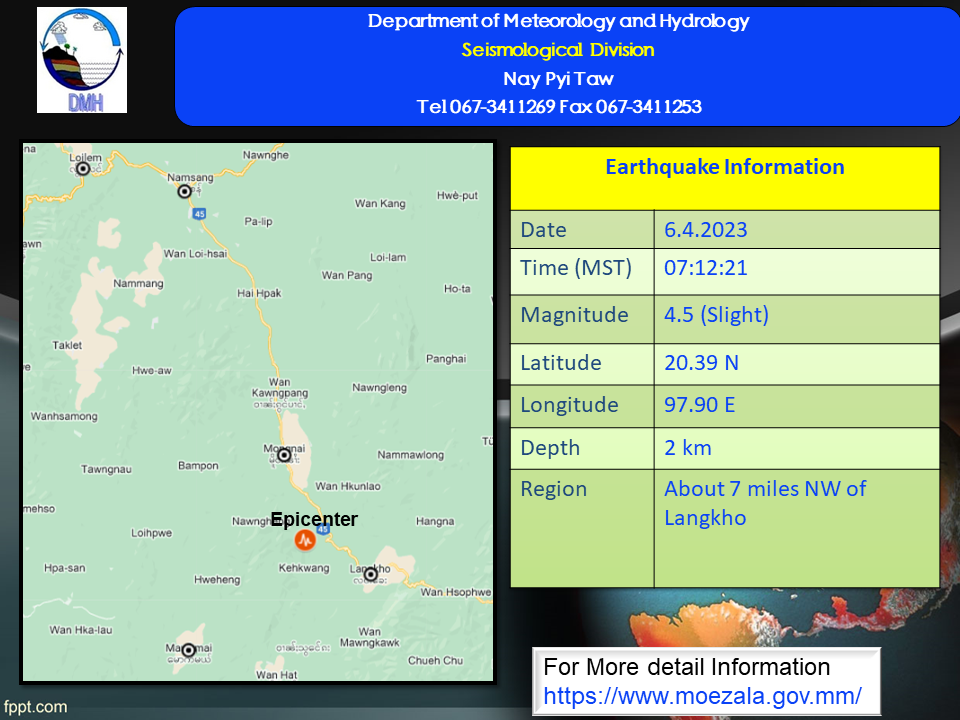 A slight earthquake of magnitude (4.5) Richter Scale with its epicenter inside Myanmar (about (7) miles northwest of Langkho), latitude 20.39 °N, longitude 97.90 °E, depth (2) kilometers, about (35) miles south-southeast of Namsang seismological observatory was recorded at (07) hr (12) min (21) sec M.S.T on 6th April, 2023.
