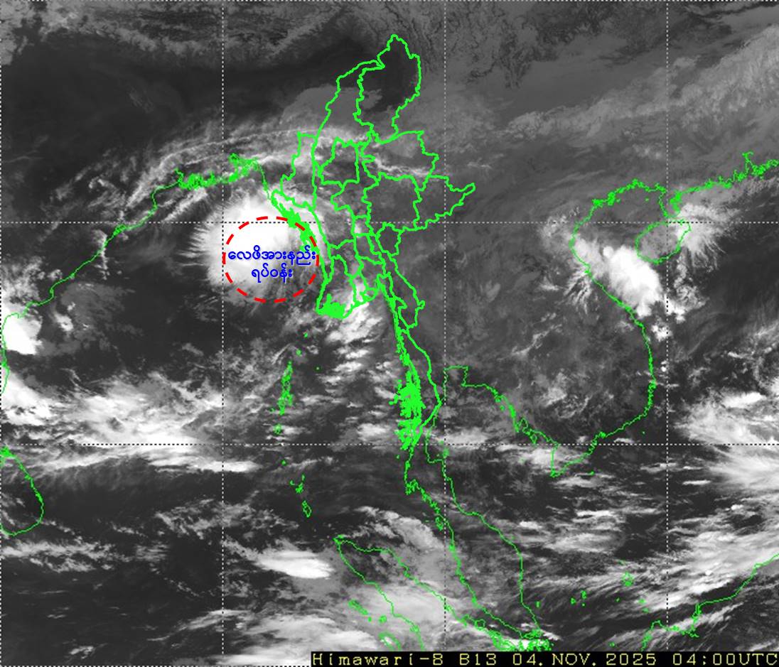 ယနေ့မြန်မာစံတော်ချိန် ၁၀:၃၀ နာရီအချိန် တိုင်းထွာချက်များအရ ဘင်္ဂလားပင်လယ်အော်အရှေ့ အလယ်ပိုင်းနှင့် ယင်းနှင့်ဆက်စပ်လျက်ရှိသော ဘင်္ဂလားပင်လယ်အော်အရှေ့မြောက်ပိုင်း၊ မြန်မာ နိုင်ငံ၊ ရခိုင်ကမ်းရိုးတန်းနှင့် ယင်းနှင့်ဆက်စပ်လျက်ရှိသော မြစ်ဝကျွန်းပေါ်ကမ်းလွန်ဒေသများတွင် ဖြစ်ပေါ်နေသော လေဖိအားနည်းရပ်ဝန်း(Low Pressure Area)သည် မြောက်- အနောက်မြောက်ဘက် သို့ရွေ့လျားခဲ့ပြီး ဘင်္ဂလားပင်လယ်အော်အရှေ့အလယ်ပိုင်းနှင့် ယင်းနှင့် ဆက်စပ်လျက်ရှိသော ဘင်္ဂလား ပင်လယ်အော်အရှေ့မြောက်ပိုင်း၊ မြန်မာနိုင်ငံ၊ ရခိုင်ကမ်းရိုးတန်းဒေသများသို့ ရောက်ရှိခဲ့ပါသည်။ အဆိုပါ လေဖိအားနည်းရပ်ဝန်းသည် မြောက်-အနောက်မြောက်ဘက်သို့ ဆက်လက်ရွေ့လျားနိုင်ပြီး ၅-၁၁-၂၀၂၅ ရက်နေ့တွင် ဘင်္ဂလားပင်လယ်အော်အရှေ့မြောက်ပိုင်းနှင့် ယင်းနှင့်ဆက်စပ်လျက်ရှိသော မြန်မာနိုင်ငံ၊ ရခိုင်ကမ်းရိုးတန်းနှင့် ဘင်္ဂလားဒေ့ရှ်နိုင်ငံကမ်းရိုးတန်းဒေသများသို့ ရောက်ရှိနိုင်သည်ဟု ခန့်မှန်းရပါသည်။