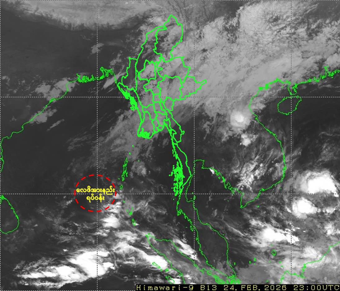 (က) ယနေ့မြန်မာစံတော်ချိန် ၀၅:၃၀ နာရီအချိန် တိုင်းထွာချက်များအရ ဘင်္ဂလားပင်လယ်အော် အရှေ့တောင်ပိုင်းတွင် ဖြစ်ပေါ်နေသော လေဖိအားနည်းရပ်ဝန်း (Low Pressure Area) သည် ဆက်လက်တည်ရှိနေပါသည်။ အဆိုပါ လေဖိအားနည်းရပ်ဝန်းသည် နောက် ၁၂ နာရီအတွင်း အရှေ့ဘက်သို့ ရွေ့လျားနိုင်ပြီး တဖြည်းဖြည်း အားလျော့သွားနိုင်သည်ဟု ခန့်မှန်းရပါသည်။