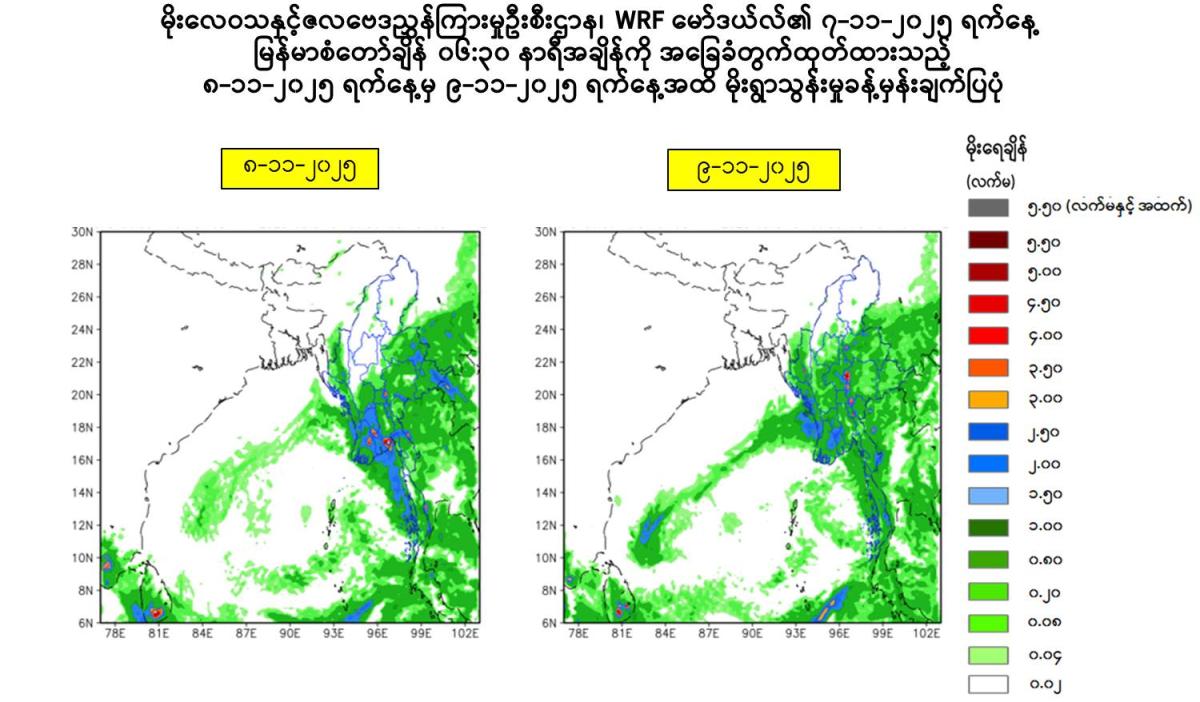 သို့ဖြစ်ပါ၍ မိုးသည်းထန်စွာရွာသွန်းခြင်းနှင့်အတူ လေပြင်းတိုက်ခတ်ခြင်း၊ မိုးထစ်ချုန်းခြင်း၊ မိုးကြိုးပစ်ခြင်း၊ လျှပ်စီးလက်ခြင်း၊ မိုးသီးကြွေခြင်း၊ လျှပ်တစ်ပြက်ရေကြီးခြင်းနှင့် မြေပြိုခြင်းစသည့် သဘာဝဘေးအန္တရာယ်များ ဖြစ်ပေါ်နိုင်ပါသဖြင့် အဆိုပါဒေသများရှိ ကုန်းမြင့်ဒေသအနီးတွင် နေထိုင် ကြသူများအနေဖြင့် မြေပြိုမှုအန္တရာယ်၊ မြစ်ငယ်၊ ချောင်းငယ်များအနီးတွင် နေထိုင်ကြသူများအနေဖြင့် ရေကြီး၊ ရေလျှံမှုများကို ကြိုတင်သတိပြုရှောင်ရှားနိုင်ပါရန်နှင့် ပြည်တွင်းရေကြောင်းသွားလာရေး၊ လေကြောင်းပျံသန်းရေးနှင့် ဆည်မြောင်းတာတမံများအနေဖြင့် လိုအပ်သည်များ ကြိုတင်ပြင်ဆင်ဆောင်ရွက် ထားနိုင်ပါရန် သတိပေးနှိုးဆော်အပ်ပါသည်။
