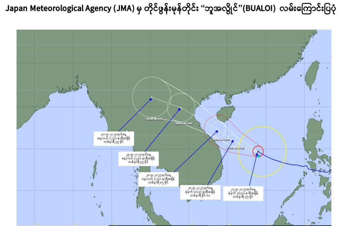ယနေ့မြန်မာစံတော်ချိန် ၁၅:၃၀ နာရီအချိန် တိုင်းထွာချက်များအရ တောင်တရုတ်ပင်လယ်ပြင်တွင် ဖြစ်ပေါ်နေသော အားကောင်းသောအပူပိုင်းမုန်တိုင်း“ဘူအလွိုင်”(BUALOI) သည်  အနောက်- အနောက် မြောက်ဘက်သို့ ရွေ့လျားခဲ့ပြီး ပိုမိုအားကောင်းလာကာ တိုင်ဖွန်းမုန်တိုင်း “ဘူအလွိုင်” အဖြစ်သို့ ရောက်ရှိ ခဲ့ပါသည်။ အဆိုပါ တိုင်ဖွန်းမုန်တိုင်း“ဘူအလွိုင်”သည် အနောက်- အနောက်မြောက်ဘက်သို့ ဆက်လက်ရွေ့လျားနိုင်ပြီး နောက် ၄၈ နာရီအတွင်း ဗီယက်နမ်နိုင်ငံမြောက်ပိုင်းကမ်းခြေဒေသများကို အားကောင်းသောအပူပိုင်းမုန်တိုင်း “ဘူအလွိုင်” အဖြစ်ဖြင့်လည်းကောင်း၊ နောက် ၇၂ နာရီအတွင်း လာအိုနိုင်ငံကို အပူပိုင်းမုန်တိုင်းငယ်အဖြစ်ဖြင့်လည်းကောင်း ဖြတ်ကျော်နိုင်သည်ဟု ခန့်မှန်းရပါသည်။
