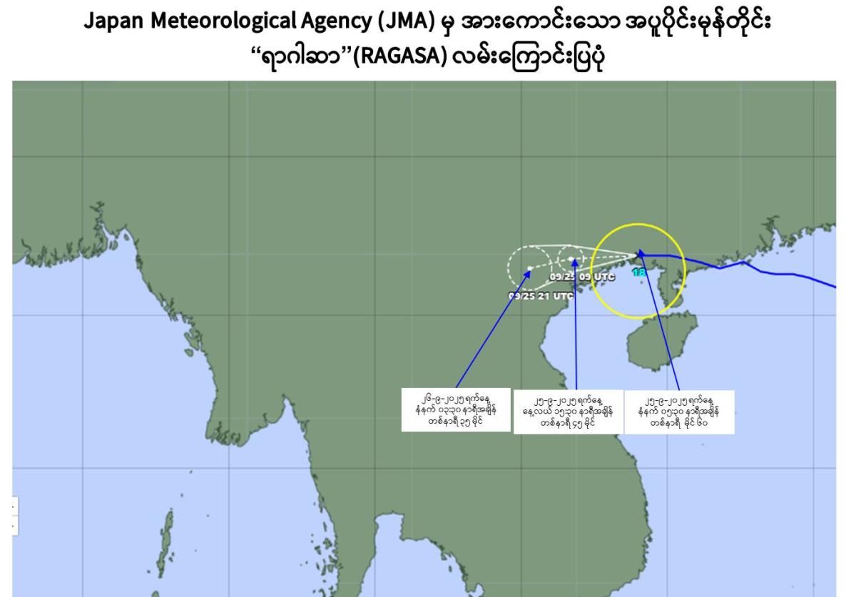 “ယနေ့မြန်မာစံတော်ချိန် ၀၅:၃၀ နာရီအချိန် တိုင်းထွာချက်များအရ တရုတ်နိုင်ငံတောင်ပိုင်း၊ ဂွမ်ဒေါင်း ပြည်နယ် ကမ်းရိုးတန်းဒေသများကို ဖြတ်ကျော်ခဲ့သော တိုင်ဖွန်းမုန်တိုင်း “ရာဂါဆာ” (RAGASA)သည် အနောက်ဘက်သို့ရွေ့လျားခဲ့ပြီး အားကောင်းသောအပူပိုင်းမုန်တိုင်း “ရာဂါဆာ” အဖြစ် အားလျော့သွား ခဲ့ကာ ကွမ်ရှီးပြည်နယ် နယ်စပ်ဒေသများသို့ ရောက်ရှိခဲ့ပါသည်။ အဆိုပါ အားကောင်းသော အပူပိုင်းမုန်တိုင်း “ရာဂါဆာ” သည် နောက် ၆ နာရီအတွင်း အပူပိုင်းမုန်တိုင်း“ရာဂါဆာ” အဖြစ်ဖြင့် ကွမ်ရှီးပြည်နယ်တောင်ပိုင်းဒေသများကို ဆက်လက်ဖြတ်ကျော်နိုင်ကာ ထိုမှတစ်ဆင့် အနောက်ဘက်သို့ ဆက်လက်ရွေ့လျားနိုင်ပြီး နောက် ၂၄ နာရီအတွင်း အပူပိုင်းမုန်တိုင်းငယ်အဖြစ်ဖြင့် ဗီယက်နမ်နိုင်ငံ မြောက်ပိုင်းဒေသများကို ဆက်လက်ဖြတ်ကျော်နိုင်သည်ဟု ခန့်မှန်းရပါသည်။”