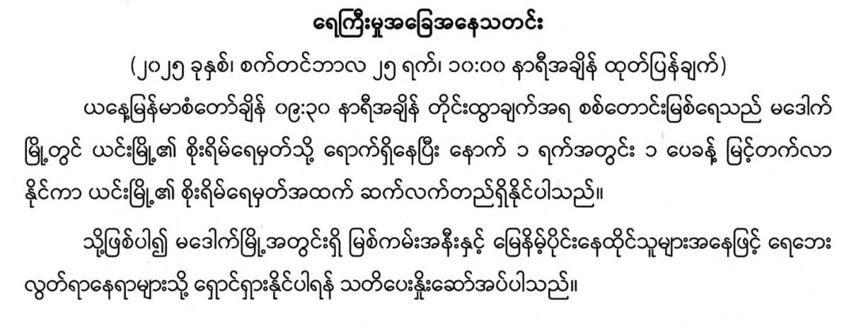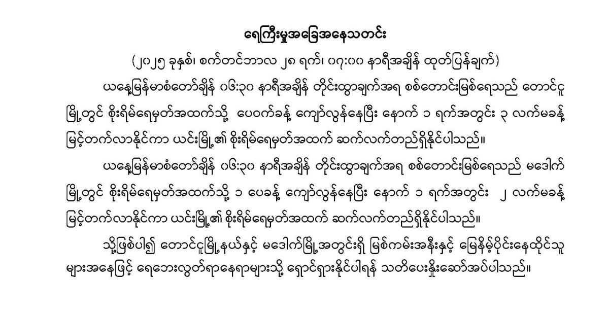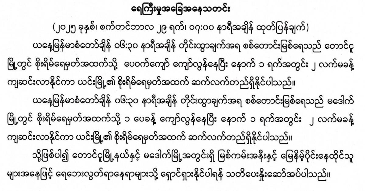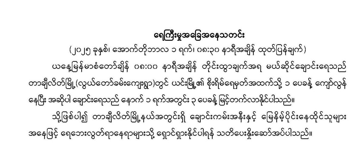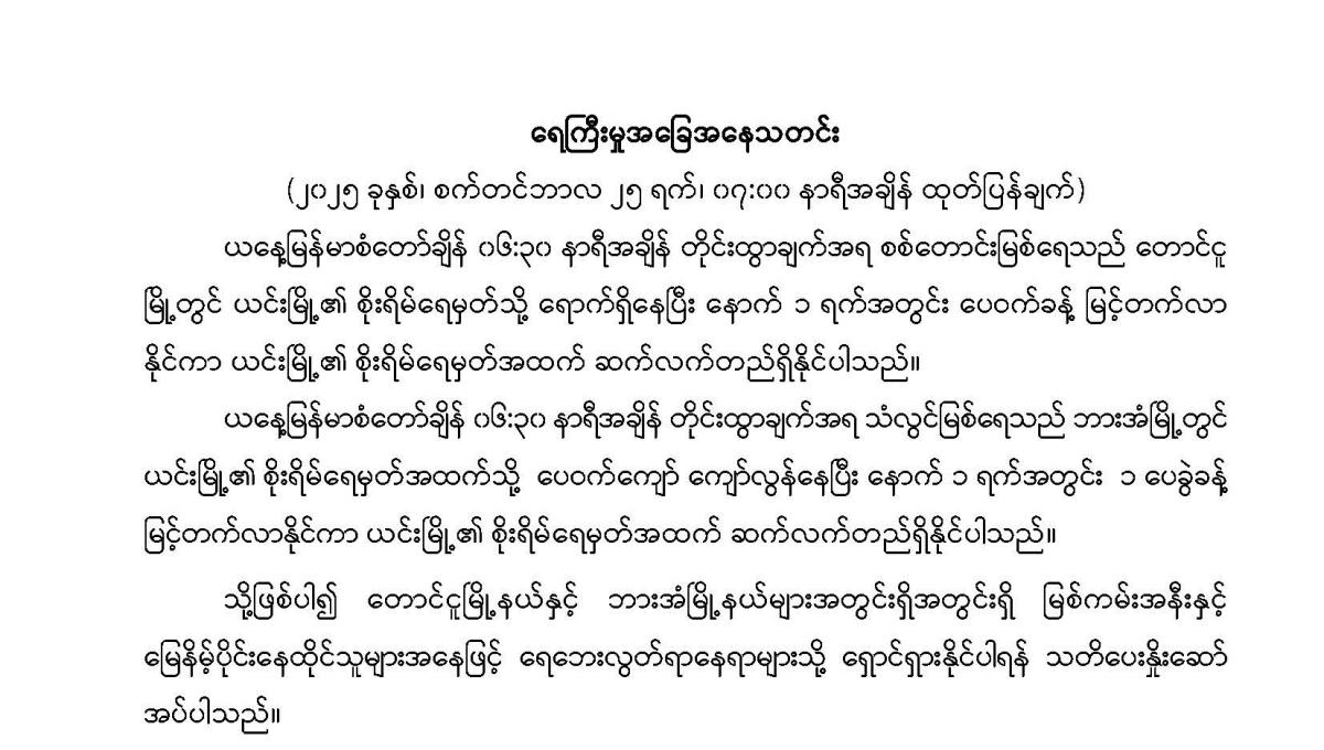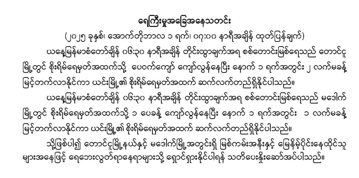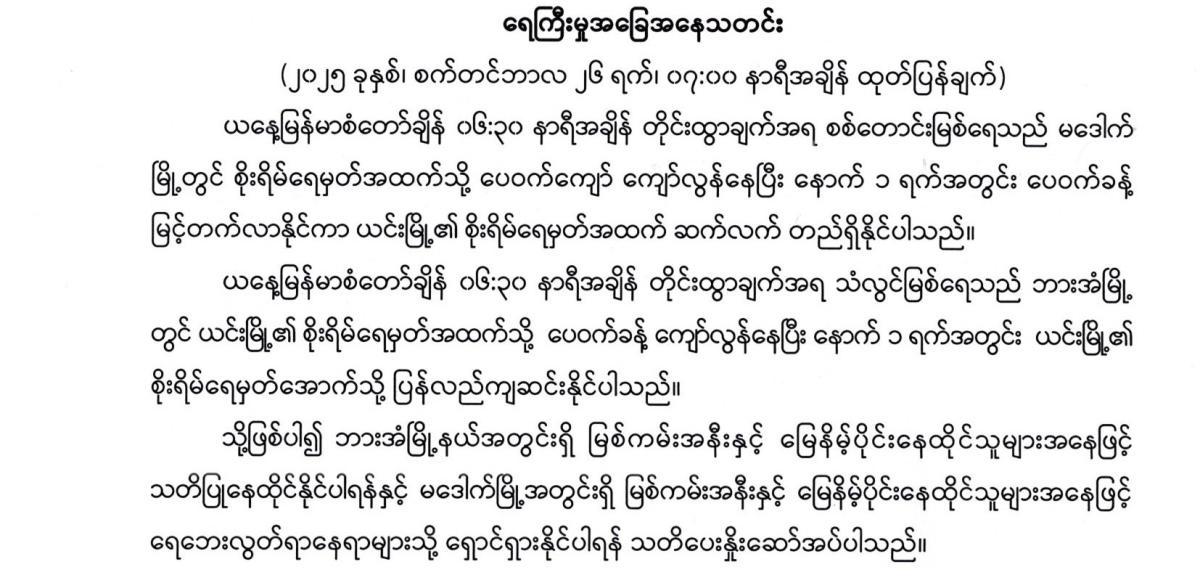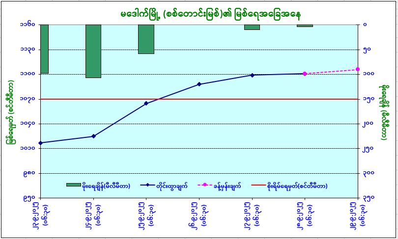 ၃-၁၁-၂၀၂၅: ယနေ့မြန်မာစံတော်ချိန် ၀၅:၃၀ နာရီအချိန် တိုင်းထွာချက်များအရ ဘင်္ဂလားပင်လယ်အော် အရှေ့အလယ်ပိုင်းနှင့် ယင်းနှင့်ဆက်စပ်လျက်ရှိသော မြန်မာနိုင်ငံ၊ မြစ်ဝကျွန်းပေါ်ကမ်းရိုးတန်းဒေသအနီးတွင် ဖြစ်ပေါ် နေသော လေဖိအားနည်းရပ်ဝန်း (Low Pressure Area) သည် ဆက်လက်တည်ရှိနေပါသည်။ အဆိုပါ လေဖိအားနည်း ရပ်ဝန်းသည် မြောက်-အနောက်မြောက်ဘက်သို့ ရွေ့လျားနိုင်ပြီး နောက် ၃၆ နာရီအတွင်း ဘင်္ဂလားပင်လယ်အော်အရှေ့ အလယ်ပိုင်းနှင့် ယင်းနှင့်ဆက်စပ်လျက်ရှိသော ဘင်္ဂလားပင်လယ်အော်အရှေ့မြောက်ပိုင်း၊ မြန်မာနိုင်ငံ၊ ရခိုင်ကမ်းရိုးတန်းနှင့် ယင်းနှင့်ဆက်စပ်လျက်ရှိသော မြစ်ဝကျွန်းပေါ် ကမ်းလွန်ဒေသများသို့ ရောက်ရှိနိုင်သည်ဟု ခန့်မှန်းရပါသည်။ ကပ္ပလီပင်လယ်ပြင် မြောက်ပိုင်း၊ ဘင်္ဂလားပင်လယ်အော်အရှေ့မြောက်ပိုင်းနှင့် အရှေ့အလယ်ပိုင်းတို့တွင် တိမ်ထူထပ်နေပြီး ကပ္ပလီပင်လယ်ပြင် တောင်ပိုင်းနှင့် ကျန်ဘင်္ဂလားပင်လယ်အော်တို့တွင် တိမ်အနည်းငယ်မှ တိမ်အသင့်အတင့် ဖြစ်ထွန်းနေပါသည်။
