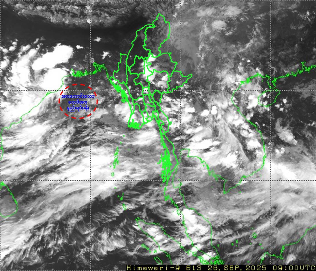 ယနေ့မြန်မာစံတော်ချိန် ၁၅:၃၀ နာရီအချိန် တိုင်းထွာချက်များအရ ဘင်္ဂလားပင်လယ်အော်အနောက် မြောက်ပိုင်းနှင့် ယင်းနှင့်ဆက်စပ်လျက်ရှိသော ဘင်္ဂလားပင်လယ်အော်အလယ်ပိုင်းတို့တွင် ဖြစ်ပေါ် နေသော အားကောင်းသောလေဖိအားနည်းရပ်ဝန်း(Well Marked Low Pressure Area)သည် ဆက်လက်တည်ရှိနေပါသည်။ အဆိုပါ အားကောင်းသောလေဖိအားနည်းရပ်ဝန်းသည် အနောက် ဘက်သို့ရွေ့လျားနိုင်ပြီး ဘင်္ဂလားပင်လယ်အော်အနောက်မြောက်ပိုင်းနှင့် ယင်းနှင့် ဆက်စပ်လျက် ရှိသော ဘင်္ဂလားပင်လယ်အော်အနောက်အလယ်ပိုင်း(အိန္ဒိယနိုင်ငံ၊ ဩရိဿပြည်နယ်တောင်ပိုင်း ကမ်းလွန်-အင်ဒရာပရာဒေ့ရှ်မြောက်ပိုင်းကမ်းခြေ)တို့တွင် နောက် ၂၄ နာရီအတွင်း မုန်တိုင်းငယ် အဖြစ်သို့ ပိုမိုအားကောင်းလာနိုင်ကာ ၂၇-၉-၂၀၂၅ ရက်နေ့တွင် ဩရိဿပြည်နယ်တောင်ပိုင်း-အင်ဒရာပရာဒေ့ရှ်မြောက်ပိုင်းကမ်းခြေတို့ကို ဖြတ်ကျော်နိုင်သည်ဟု ခန့်မှန်းရပါသည်။