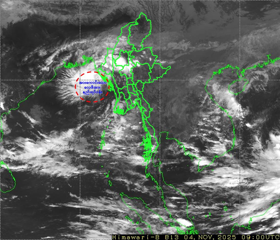 ယနေ့မြန်မာစံတော်ချိန် ၁၅:၃၀ နာရီအချိန် တိုင်းထွာချက်များအရ ဘင်္ဂလားပင်လယ်အော်အရှေ့ မြောက်ပိုင်းနှင့် ယင်းနှင့်ဆက်စပ်လျက်ရှိသော ဘင်္ဂလားပင်လယ်အော်အရှေ့အလယ်ပိုင်း၊ မြန်မာနိုင်ငံ၊ ရခိုင်ကမ်းရိုးတန်းဒေသများတွင် ဖြစ်ပေါ်နေသော လေဖိအားနည်းရပ်ဝန်း (Low Pressure Area) သည် ပိုမိုအားကောင်းလာကာ အားကောင်းသောလေဖိအားနည်းရပ်ဝန်း (Well Marked Low Pressure Area) အဖြစ်သို့ ရောက်ရှိခဲ့ပါသည်။ အဆိုပါ အားကောင်းသောလေဖိအားနည်းရပ်ဝန်းသည် မြောက်- အနောက်မြောက်ဘက်သို့ ရွေ့လျားနိုင်ပြီး ၅-၁၁-၂၀၂၅ ရက်နေ့တွင် ဘင်္ဂလားပင်လယ်အော်အရှေ့ မြောက်ပိုင်းနှင့် ယင်းနှင့်ဆက်စပ်လျက်ရှိသော မြန်မာနိုင်ငံ၊ ရခိုင်ကမ်းရိုးတန်းမြောက်ပိုင်းနှင့် ဘင်္ဂလားဒေ့ရှ်နိုင်ငံကမ်းရိုးတန်းဒေသများသို့ ရောက်ရှိနိုင်သည်ဟု ခန့်မှန်းရပါသည်။