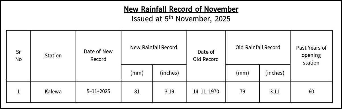 According to the observations at 09:30 hrs MST, the new 24 hrs rainfall record was observed for the month of November-