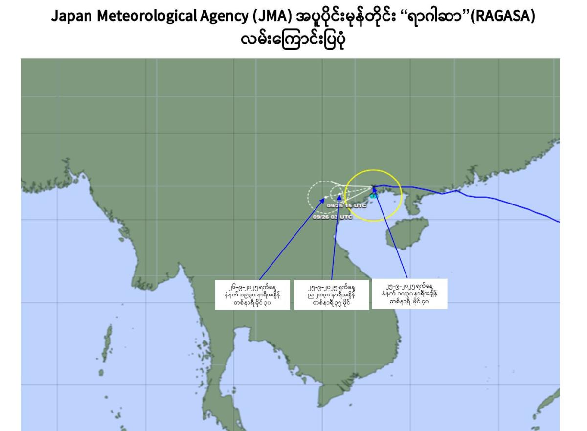 According to the observations at 10:30 hrs MST today, the Severe Tropical Storm “RAGASA” crossing Southern part of Guangxi, South China Sea has moved Westwards and downgraded into a Tropical Storm “RAGASA”, still crossing into the Southern part of Guangxi. It is likely continute to move West- Westwards and it may pass over the northern part of Vietnam as a tropical depression during next 12 hours.