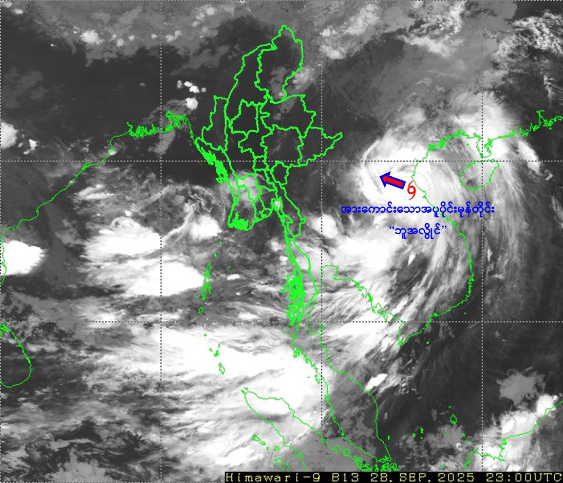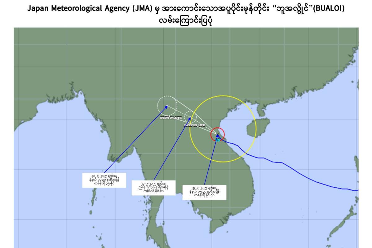 Due to the reminant of cloud from the Severe Tropical Storm “BUALOI”, rain or thundershowers will be fairly widespread to widespread in Naypyitaw, Yangon, Mandalay, Bago, Magway, Sagaing, Ayeyarwady, Taninthayi Regions and Kachin, Kayah, Kayin, Chin, Mon, Rakhine, Shan States with regionally and isolated heavyfalls in some region during today evening to 1-10-2025. Occasional squalls with rough seas will be experienced off and along Myanmar Coasts. Surface wind speed in squalls may reach 35 mph. Wave height will be about 10-12 feet off and along Myanmar Coasts.Advisory