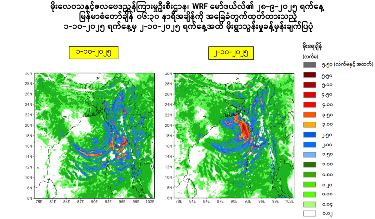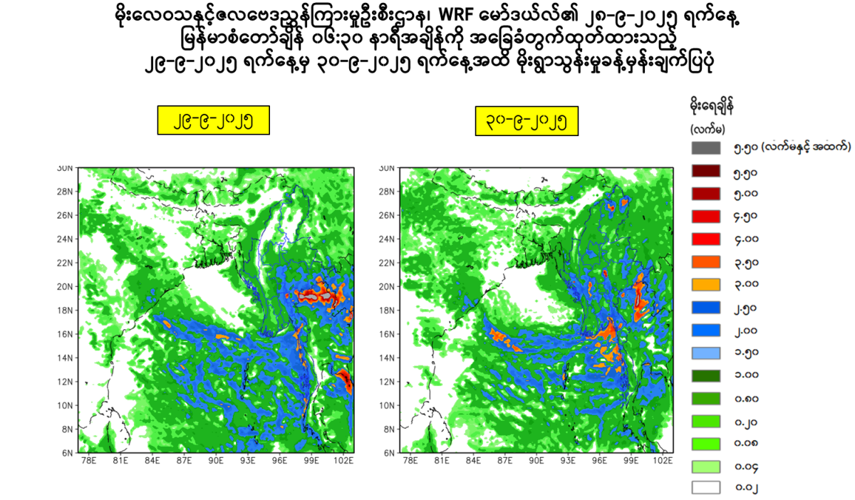 According to the observations at 15:30 hrs MST today, due to the strong monsoon over the Andaman Sea and Bay of Bengal, due to the reminant of cloud from the Typhoon “BUALOI” over the South China sea, due to the unstable air condition over the Andaman Sea and Bay of Bengal, rain or thundershowers will be scattered in Upper Sagaing Region and Kachin, Northern Shan States and fairly widespread to widespread in Naypyitaw, Yangon, Mandalay, Bago, Magway, Lower Sagaing, Ayeyarwady, Taninthayi Regions and Kayah, Kayin, Chin, Mon, Rakhine, (Southern and Eastern)Shan States with regionally and isolated heavyfalls in some region during today evening to 3-10-2025. Occasional squalls with rough seas will be experienced off and along Myanmar Coasts. Surface wind speed in squalls may reach 35 mph. Wave height will be about 10-12 feet off and along Myanmar Coasts.