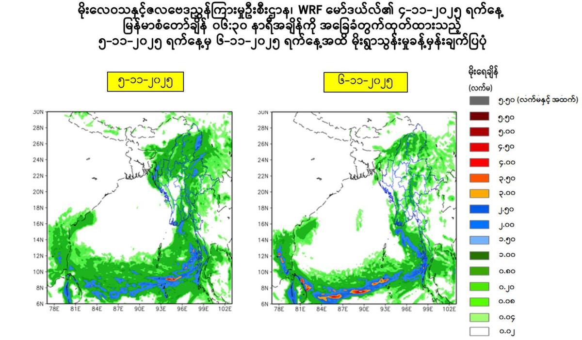 According to the observations at 15:30 hrs MST today, due to the Easterly waves and due to a Low Pressure Area over the Northeast Bay and adjoining Eastcentral Bay of Bengal and off and along Rakhine coasts, Myanmar and due to the Cumulonimbus Clouds formed by strong convection rain or thundershowers will be fairly widespread to widespread in Naypyitaw, Yangon, Mandalay, Bago, Magway, Sagaing, Ayeyarwady, Taninthayi Regions and Kachin, Kayah, Kayin, Chin, Mon, Rakhine, Shan States with isolated heavyfalls in some region during 5-11-2025 to 6-11-2025.