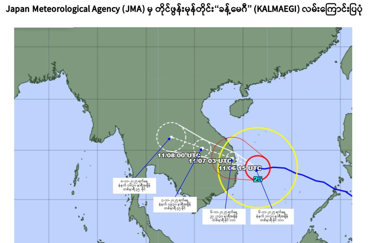 Due to the reminant of cloud from Typhoon “KALMAEGI”, rain or thundershowers will be fairly widespread to widespread in Naypyitaw, Yangon, Bago, Ayeyarwady, Taninthayi Regions and Kayah, Kayin, Mon, Rakhine, (Southern and Eastern) Shan States with regionally and isolated heavyfalls in some region during 8-11-2025 to 10-11-2025. Squalls with moderate to rough seas are likely at times in Deltaic, Gulf of Mottama, off and along Mon-Taninthayi Coasts. Surface wind speed in squalls may reach 25-30 mph. Wave height will be about 7-9 feet Deltaic, Gulf of Mottama, Mon-Taninthayi Coasts.